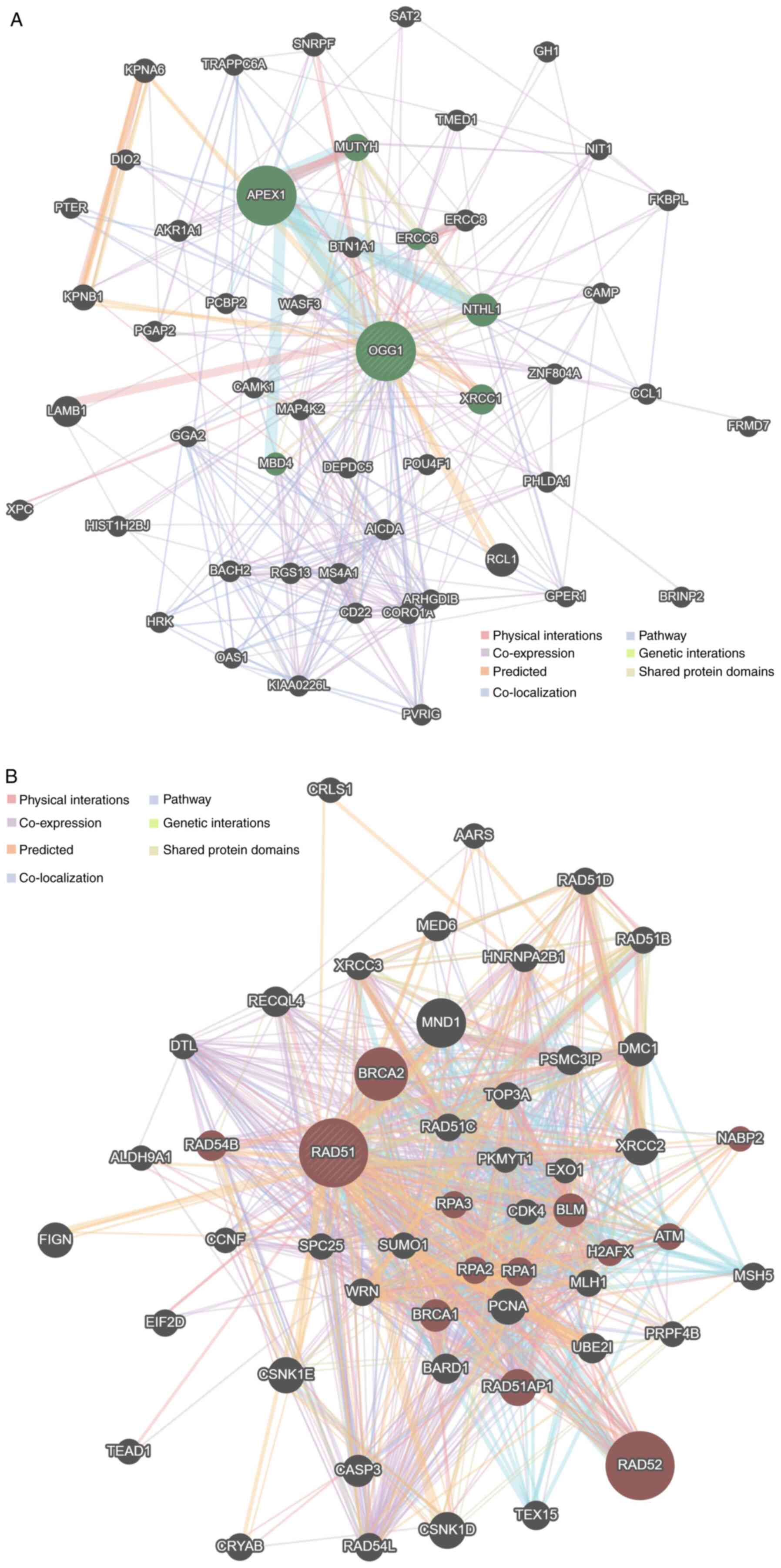 Two networks were generated for the OGG1 gene and the RAD51 gene. For each gene, the PPI network revealed a total of 50 interacting genes for the OGG1 gene (Fig. 2A) and the RAD51 gene (Fig. 2B).