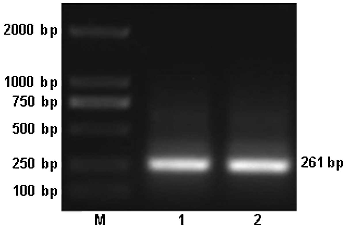 After PCR amplification of positive colonies, the electrophoretogram also showed a 261-bp-long band (Fig. 2). The sequencing results of the identified positive plasmid showed that the 237 bp sequence from 46 to 282 bp was consistent with the GenBank database of pGL3-control (accession no. U47296). The sequences from 40 to 45 bp and from 283 to 288 bp were restriction enzyme cutting sites of EcoRI and SalI, respectively. No base transition, transversion, insertion and deletion were found (Fig. 3).