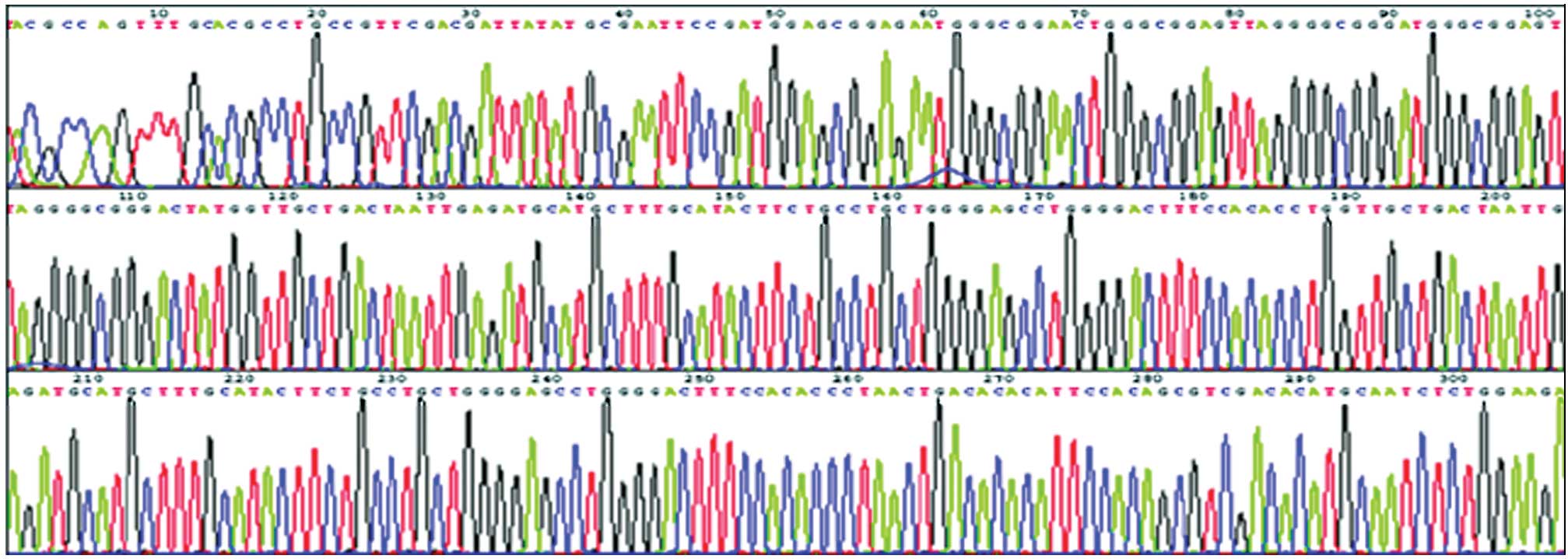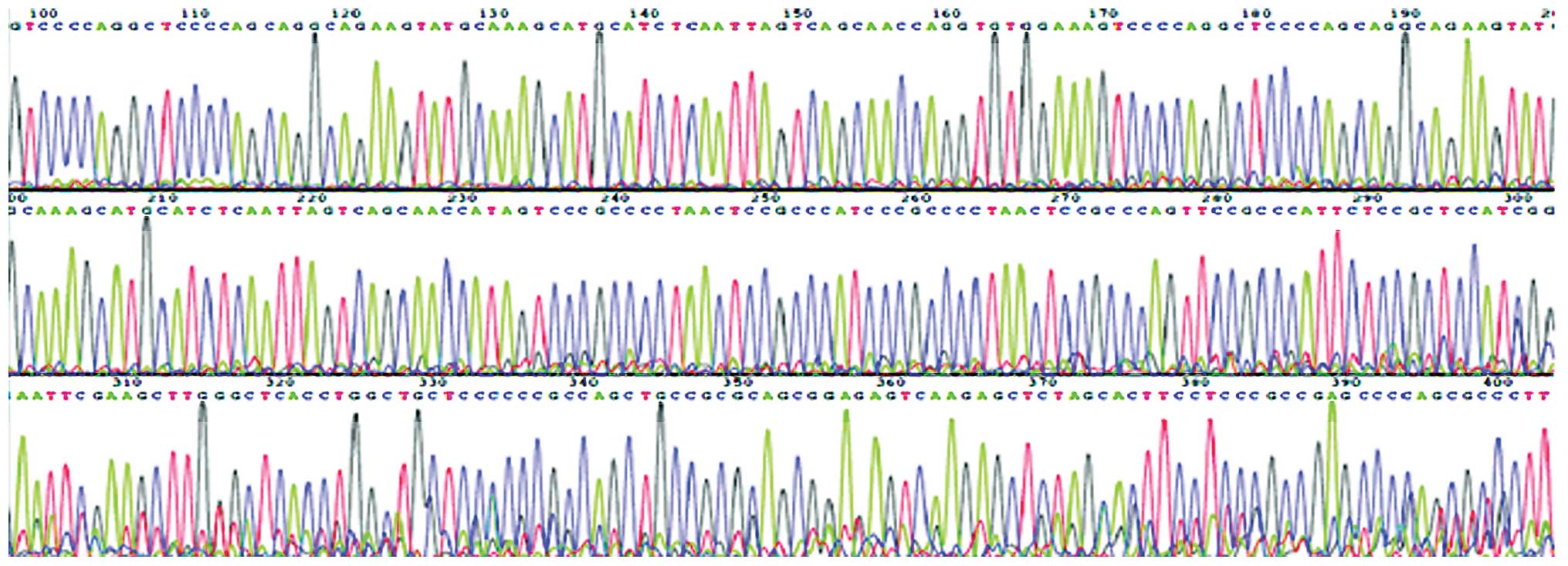 Recombinant plasmid pEGFP-Hp-SV40e was identified by double digestion with EcoRI and/or SalI. Two fragments were detected in the electrophoresis when the recombinant plasmid pEGFP-Hp-SV40e was digested by double digestion with EcoRI and SalI. Only a single fragment was found if the plasmid was digested with EcoRI or SalI. This finding proved that the recombinant plasmid was correctly constructed. When plasmid pEGFP-Hp-SV40e was used as a template, the SV40 enhancer fragment was amplified, and the sequencing results were consistent with those of the GenBank data. Following reverse sequencing, complementary sequences of the recombinant plasmid pEGFP-Hp-SV40e were obtained using Chromas Lite software. The plasmid contained a complete 237-bp SV40 enhancer sequence corresponding with the bases between 65 and 301 bp in the sequencing graph (Fig. 5). The sequences of 59–64 and 302–307 bp were restriction enzyme cutting sites of SalI and EcoRI, respectively. The downstream sequence of the HindIII site was the DNA sequence of HPSE promoter in the vector. These findings showed that the SV40 enhancer sequence was properly inserted downstream of the HPSE promoter in plasmid pEGFP-Hp and that recombinant plasmid pEGFP-Hp-SV40e was successfully constructed.