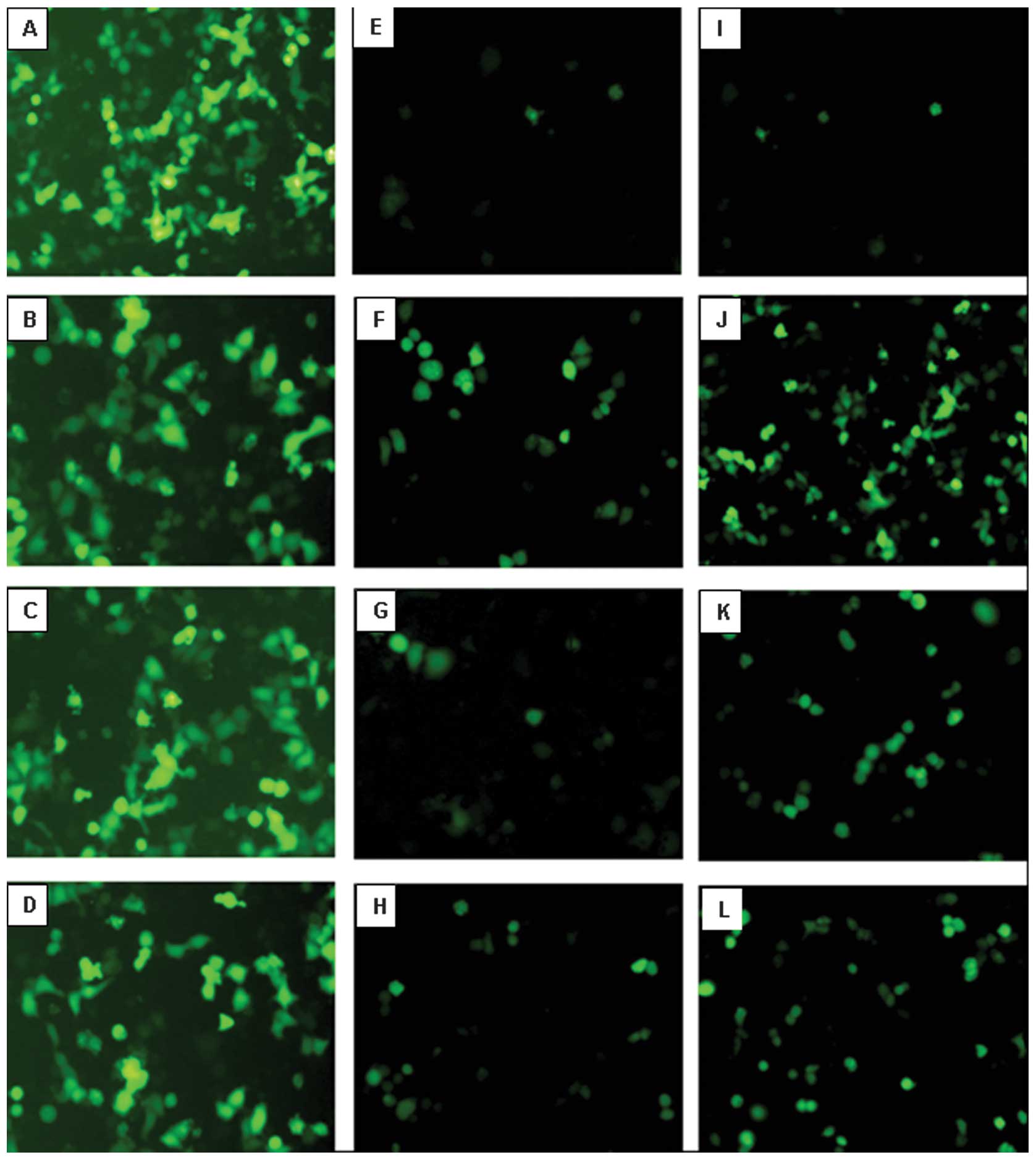 Fluorescence microscopy showed that the fluorescence intensity of plasmid pEGFP-Hp was the weakest in normal ECV cells and enhanced in human tumor cell lines HepG2, Hep2 and K562. Positive control of plasmid pEGFP-N1 showed a strong fluorescence expression in all of the cells. The fluorescence intensity of recombinant plasmid pEGFP-Hp-SV40e in normal ECV cells was weak while the fluorescence intensity in the 3 types of tumor cells was stronger than that of pEGFP-Hp and similar to pEGFP-N1 (Fig. 6). Flow cytometric analysis detected the percentage of light-emitting cells of plasmid pEGFP-Hp to be only 4.1±0.3% in ECV cells; and 17.2±1.9, 8.8±1.0 and 6.4±0.5% in HepG2, Hep2 and K562 cells, respectively. The positive control plasmid pEGFP-Hp was found to have higher transfection rates in all cells and the percentages of light-emitting cells were 18.3±1.9, 29.3±3.0, 17.0±1.8 and 13.0±1.2%, in ECV, HepG2, Hep2 and K562 cells, respectively, suggesting that it also had a high activity in normal ECV cells. The light-emitting cell percentages of recombinant plasmid pEGFP-Hp-SV40e were 4.3±0.4, 28.8±2.9, 16.4±1.5 and 11.7±1.2%, in ECV, HepG2, Hep2 and K562 cells, respectively. The ratios of transfection rates of pEGFP-Hp-SV40e vs. pEGFP-Hp were 1.05, 1.67, 1.86 and 1.83, in the four cell lines, respectively. These findings suggest that inserting SV40 enhancer did not affect the transfection efficiency of pEGFP-Hp in normal ECV cells, but that it is capable of increasing HPSE promoter activity in tumor cells.