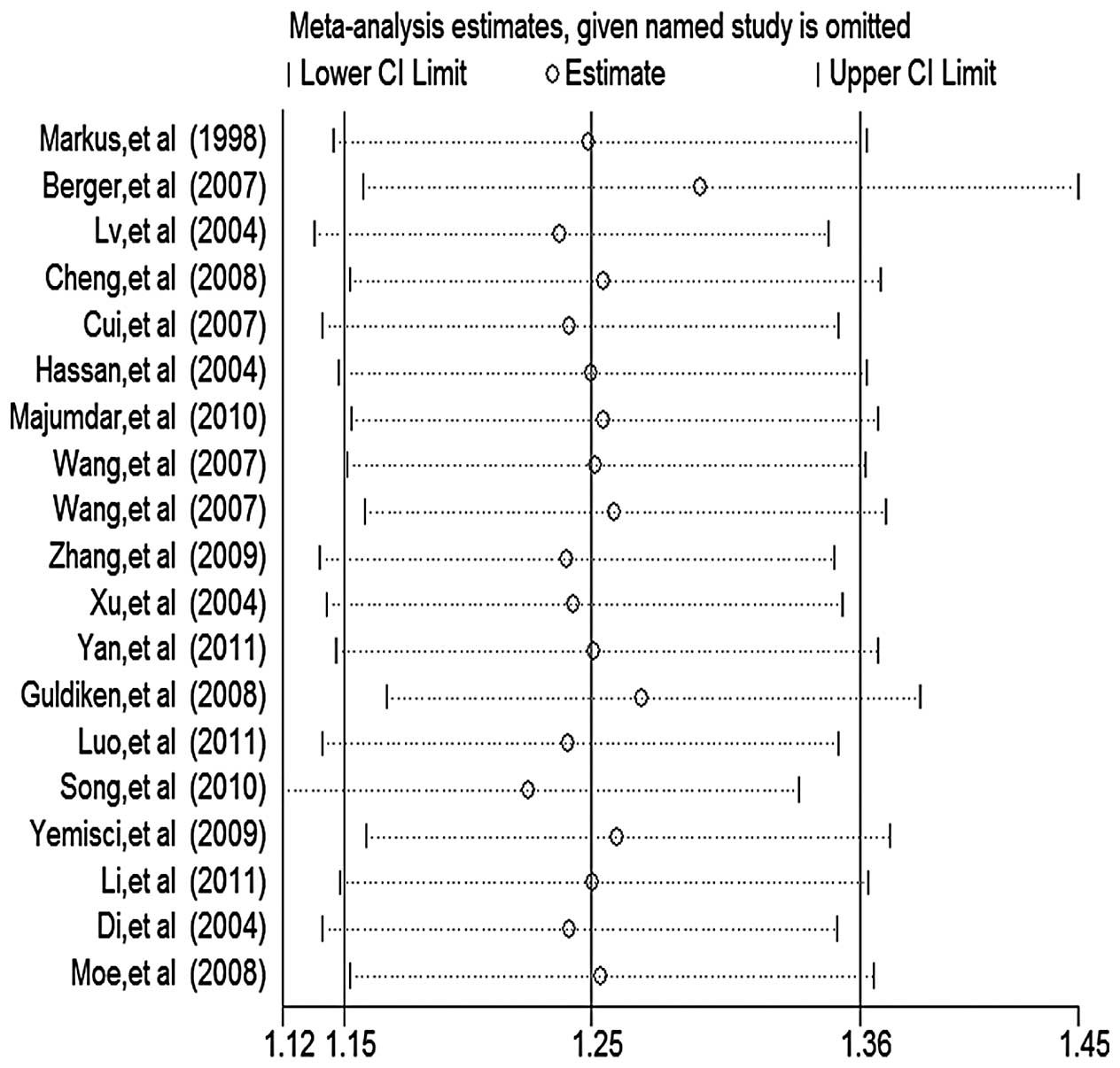 Pooled analysis was shown in Table II. Unlike a previous meta-analysis (9), this meta-analysis showed a significant association between T allele and ischemic stroke, in the dominant (REM OR 1.256; 95% CI, 1.066–1.480); codominant (REM OR 1.237; 95% CI, 1.084–1.412) and recessive (FEM OR 1.257; 95% CI, 1.094–1.446) models. A significant association was found between T allele and an increased risk of stroke following the exclusion of studies deviating from HWE in controls and sensitive analysis for the dominant (FEM OR 1.249; 95% CI, 1.145–1.361), recessive (FEM OR 1.255; 95% CI, 1.082–1.456) and codominant (FEM OR 1.195; 95% CI, 1.115–1.281) models.