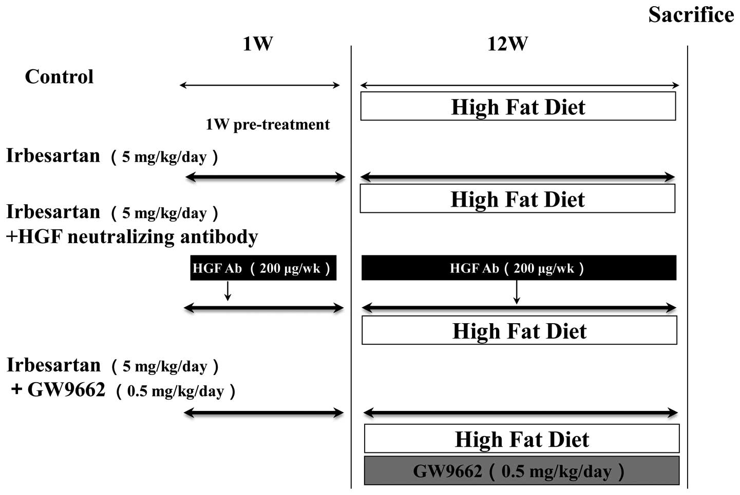 Ten-week old mice (n=6 per group) were fed a high-fat diet (HFD) (MF plus 0.5% (wt/wt) cholesterol and 10% yashi oil; Oriental Yeast Co., Ltd., Tokyo, Japan). Mice were divided into four groups: i) the control group, ApoE KO mice with HFD only; ii) the irbesartan group, ApoE KO mice with HFD and 5 mg/kg/day irbesartan; iii) the HGF antibody group, ApoE KO mice with HFD, 5 mg/kg/day irbesartan and 200 μg/week HGF neutralizing antibody and iv) the GW9662 group, ApoE KO mice with HFD, 5 mg/kg/day irbesartan and 0.5 mg/kg/day GW9662 (Fig. 1). Drugs were dissolved in water and administered ad libitum. There were 6 mice/group, which were housed in the animal facilities of the Osaka University (Osaka, Japan). The mice had free access to water and food during the experimental period. Following three months of drug and HFD treatment, the mice were sacrificed. Samples of epididymal adipose tissue and liver were evaluated.