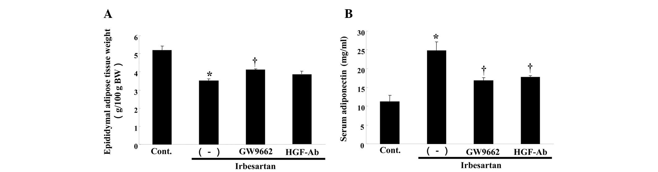 Irbesartan also reduced the weight of epididymal adipose tissue (Fig. 3A). This effect was also attenuated by anti-HGF antibody or GW9662 treatment (Fig. 3A). Notably, irbesartan significantly increased the serum adiponectin level, while anti-HGF antibody or GW9662 treatment decreased the serum adiponectin level (Fig. 3B).