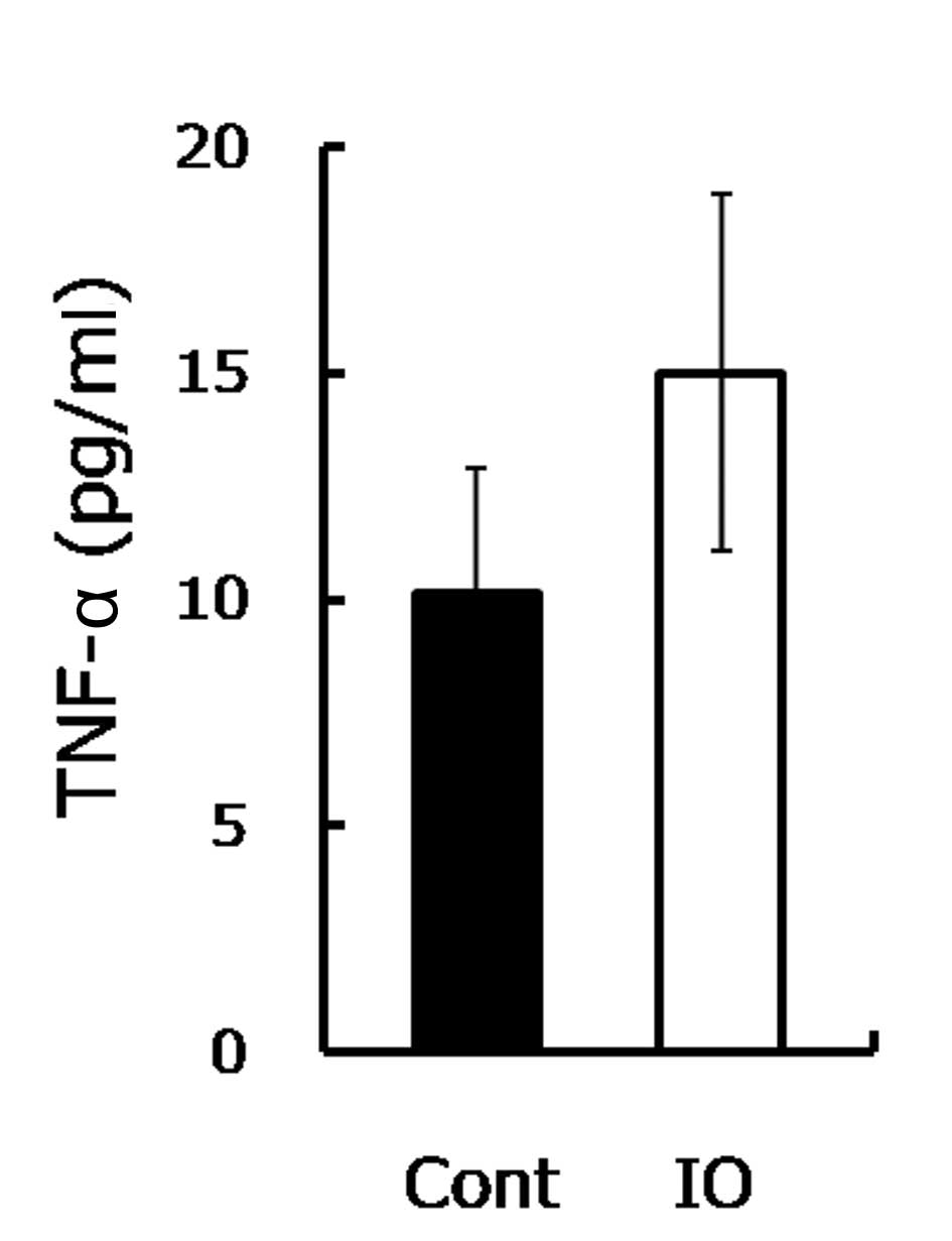 The increased bone resorption indicated that the osteoclastic activity was stimulated. Since IO was demonstrated to induce the TNF-α expression that further triggers osteoclastic function (13,22,23), the TNF-α level was measured. Consistent with a previous study (13), the TNF-α level in the IO mice was approximately 1.5-fold higher compared to the control group (Fig. 3), as shown. TNF-α was demonstrated to be involved in the enhancement of the development of osteopenia and osteoporosis (14,15). TNF-α promoted osteoclastogenesis through synergizing with a permissive level of the receptor activator of NF-κB ligand (RANKL), as well as through directly affecting osteoclasts (16,17). In the current study, a high serum TNF-α level was observed in mice with IO. The increased TNF-α is likely to promote the osteoclastic function and enhance inflammatory osteolysis, resulting in advanced bone resorption (24). Therefore, upon IO exposure, although increased TNF-α was not involved in mineralization inhibition, it accelerated bone loss and eventually reduced bone strength.