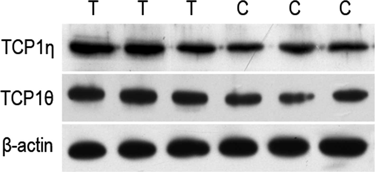TCP1 is a molecular chaperone protein and its subtypes are involved in numerous pathways, including the assembly and folding of various intracellular proteins. Coghlin et al (26) reported a high expression of TCP1β and TCP1ε in colon cancer and suggested that TCP1β may be associated with the clinical outcome of colon cancer patients via the use of 2D gel electrophoresis based on biomass spectrum. Iijima et al (27) demonstrated that TCP1α is able to prompt cell proliferation. We identified the differences in the expression of TCP1η and TCP1θ between human liver cancer cells and normal liver cells and we obtained identical results via western blot analysis (Fig. 5). This suggested that TCP1η and TCP1θ may also participate in the progression of human liver cancer. In this study, we screened for differential 14-3-3 and TCP1 protein families and also observed that the expression of P70, hypothetical protein or other proteins in human liver cancer cells were different from those in normal liver cells. The differential proteins, including 14-3-3 and TCP1 protein families, may be a potential target in the treatment of liver cancer and a tumor labeling index associated with liver cancer, playing a critical role in the occurrence, drug resistance, metastasis and recurrence of liver cancer or other pathological processes.