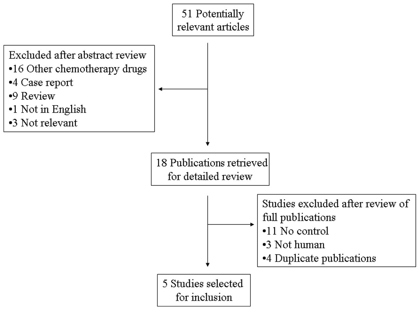 A total of 51 potentially relevant citations were reviewed and five studies met the inclusion criteria in the search strategy and study selection section, comprising 793 patients for the final analysis (Fig. 1). Of the five studies, three were prospective randomized control trials, whereas the remaining two were retrospective studies. The major baseline characteristics of the five eligible publications are presented in Table I. The studies were conducted in four countries (Japan, Korea, the United States of America and the United Kingdom) and were published between 2003 and 2012. The dose of pyridoxine varied from 50 to 600 mg/day. All the studies reported the incidence of HFS in patients receiving capecitabine. As regards chemotherapy outcome, two trials (15,16) compared the treatment outcome between the two groups according to the response evaluation criteria in solid tumors (17). The characteristics of the included trials are listed in Table I. The NCI-CTC criteria are listed in Table II.