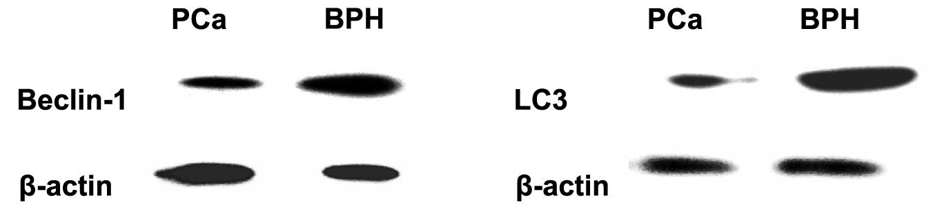 Autophagy-related genes Beclin-l and LC3 may suppress tumor growth by inducing autophagy. Therefore, they are considered a potential therapeutic target in cancer management. It was previously reported that deletion mutations of the Beclin-1 gene were detected in 75% of ovarian cancers, 50% of breast cancers and 40% of PCas (16). We used western blot analysis to detect the expression of Beclin-l and LC3 in PCa and BPH tissues. None of the patients had received the 5α-reductase inhibitor, in order to minimize the interference factors induced by oxygen deficiency and starvation. Following in vitro sectioning, the surgical specimens were immediately immersed in cell culture solution and total protein was extracted after 30 min. The results demonstrated that the expression of Beclin-1 and LC3 was lower in PCa compared to BPH tissues (P<0.001), as previously described in the literature and indicated that the reduction of Beclin-1 and LC3 expression may be associated with the development of PCa. However, there were no significant differences between tumors of different Gleason scores (P>0.05). Therefore, whether autophagy is associated with tissue differentiation and the prognosis of PCa remains unclear. However, for PCa patients under androgen ablation treatment, autophagy may exert a protective effect on PCa cells. It was previously indicated (13,14) that androgen deprivation may decrease the phosphorylation of p70S6K. Considering that p70S6K is a readout of mammalian target of rapamycin (mTOR) activity and a downstream effector of mTOR, androgen deprivation may induce autophagy in LNCaP cells. Therefore, PCa cells may exploit the autophagic pathway to antagonize apoptosis during androgen ablation therapy, at least for a short period of time, and finally become androgen-independent. When autophagy was inhibited, LNCaP cell apoptosis was significantly increased in the absence of dihydrotestosterone (13,14).