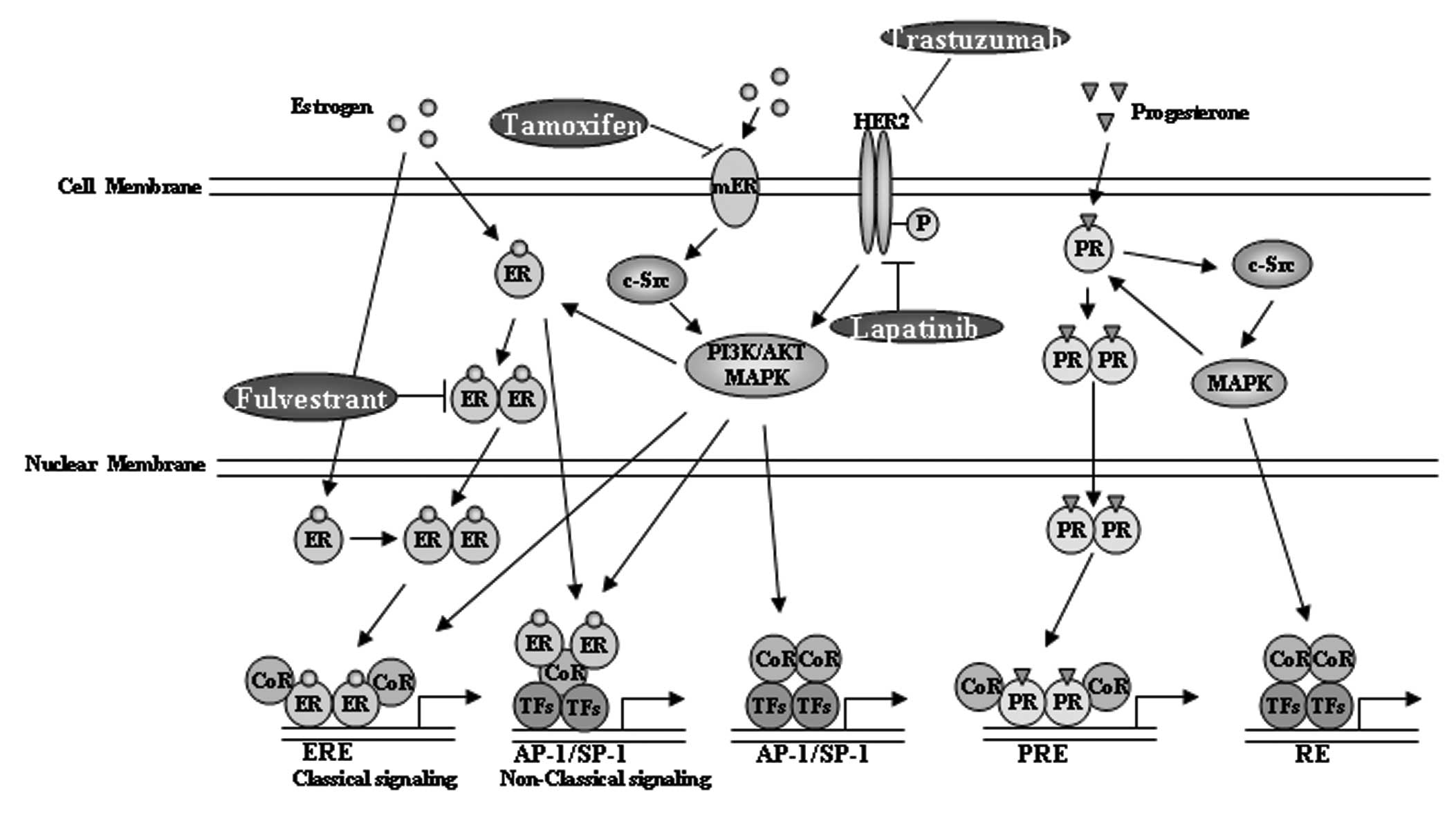 Since luminal subtype A and B breast cancer cells are ER+ and/or PR+, patients with these two types of breast cancer are always subjected to endocrine therapy with tamoxifen, to inhibit the functions of ER (57), and aromatase inhibitors or inactivators (58), to block estrogen production or to inactivate ERs, or even to inhibit the dimerization and downregulate ERs (59–61). The therapeutic strategies that may interrupt the estrogen signaling pathway have been proven effective for the ER+ subtype of breast cancer (62) and are currently the first-line clinical treatment option (63,64) (Fig. 1).