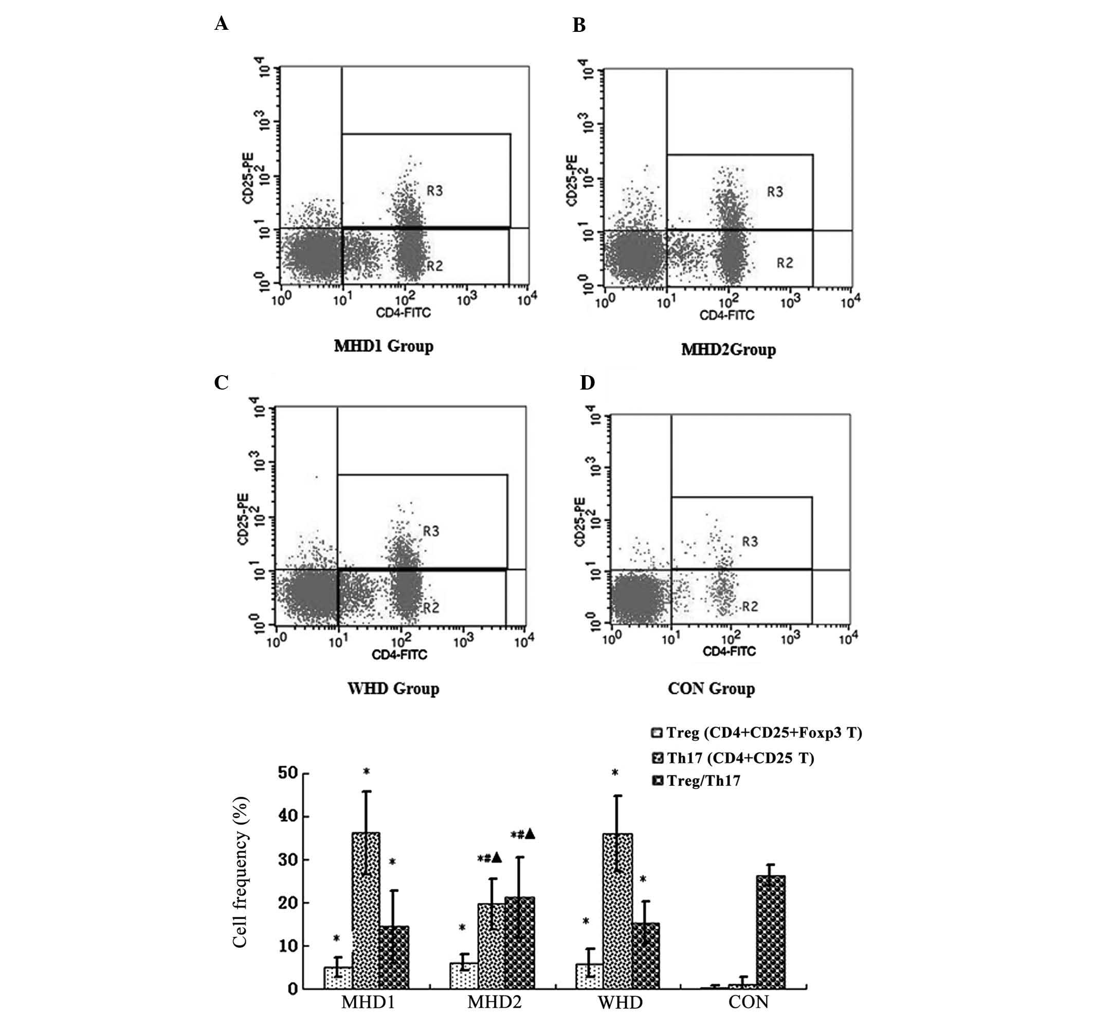 As shown in Table II and Fig. 1, the frequencies of Treg and Th17 cells were significantly higher in the uremic groups when compared with the CON. By contrast, the ratio of Treg/Th17 was lower in the uremic groups compared with the CON (P<0.05). No significant differences of the Treg frequencies were identified among the WHD, MHD1 and MHD2 subgroups (P>0.05). The WHD subgroup had a markedly higher frequency of Th17 cells and a notably lower Treg/Th17 ratio compared with the MHD2 subgroup (P<0.05). Between the MHD subgroups, the Th17 frequencies of the MHD1 subgroup were notably higher, while the Treg/Th17 ratio was notably lower compared with the MHD2 group (P<0.05).