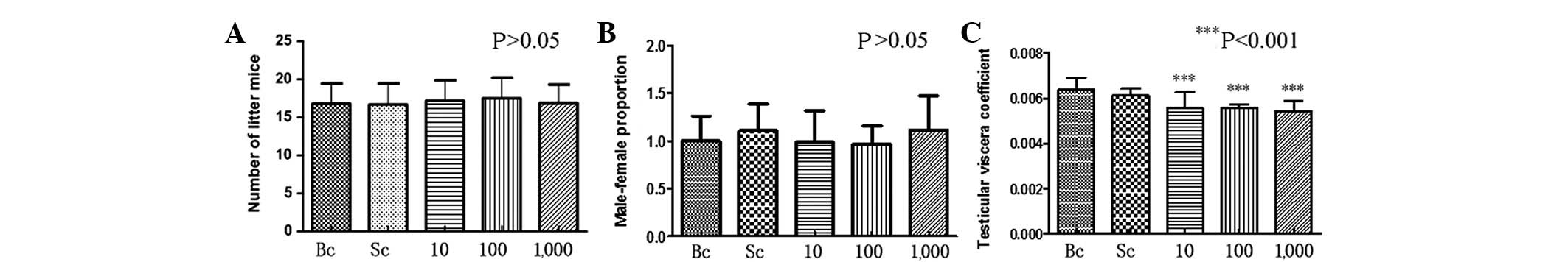 Compared with the control group, there was no significant difference in the number of litter mice and the male:female ratio of the BPA-exposed pregnant mice (P>0.05) (Fig. 1A and B). A slight difference was detected between the testicular viscera coefficient in the BPA-exposed male offspring mice compared with the control group. This difference was statistically significant (P<0.001) (Fig. 1C).