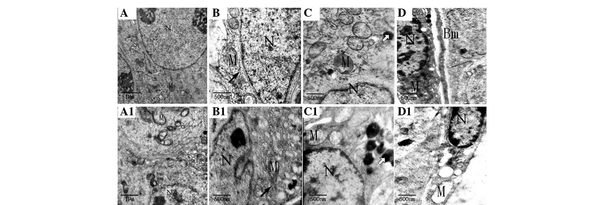 Fig. 2A shows that the spermatogenous cells were normal in the blank control group, the nuclear membrane and nucleolus were visible and the structure of the mitochondria and other organelles was clear. However, Fig. 2A1 shows that the nuclear membrane was blurred, while some mitochondria revealed alterations in vacuoles and mild expansion of the endoplasmic reticulum in the BPA (100 nmol/l) group. In Fig. 2B it is evident that the Sertoli cells of the blank control group were normal, with clear nuclear membrane and no evident morphological abnormalities in mitochondria and other organelles. By contrast, experimental results in Fig. 2B1 show that some mitochondria had alterations in vacuoles and mild expansion in the endoplasmic reticulum in the BPA (100 nmol/l) group. Fig. 2C shows that Leydig cells in the blank control group exhibited clear nuclear membrane, normal morphological organelles and had a few lysosomes. By contrast, Fig. 2C1 demonstrates that mitochondria had alterations in the vacuoles and that additional and larger lysosomes were present. Fig. 2D reveals that peritubular myoid cells in the blank control group had no evident abnormalities and thickness of the basement membrane was uniform. However, Fig. 2D shows a large number of vacuolated mitochondria in peritubular myoid cells of the BPA (100 nmol/l) group.