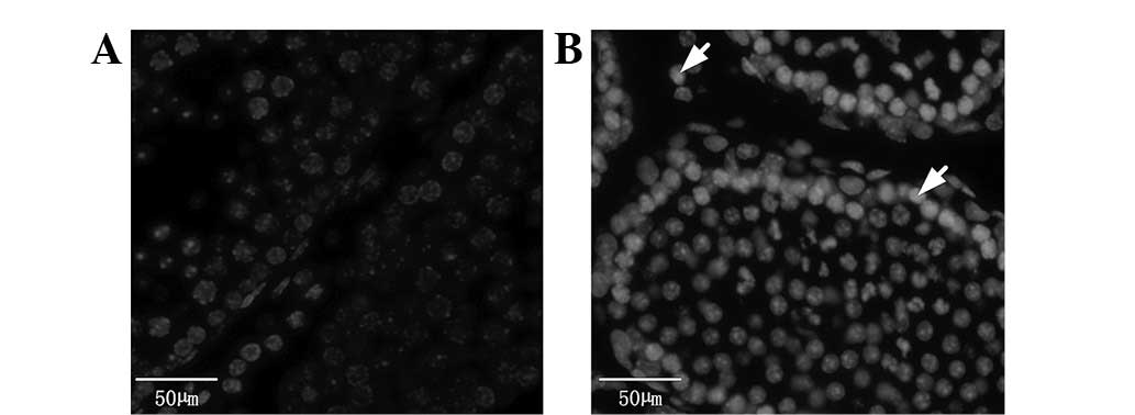 Hoechst 33258 staining was used to detect testicular apoptosis. Paraffin sections were conventionally dewaxed, dehydrated, washed twice in phosphate-buffered saline (PBS) for 3 min and rehydrated. Then, 0.5 ml Hoechst 33258 staining solution was added to the slices, which were stained after 10 min and washed three times for 5 min in PBS. The sections were then added to anti-fluorescence quenching liquid, covered with a clean coverslip and observed by fluorescence microscopy.