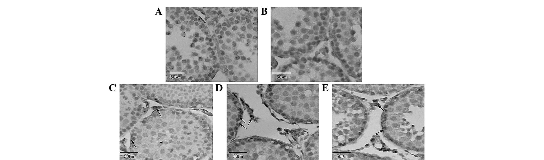 Signs of apoptosis include DNA fragmentation, caspase activation and phosphatidylserine externalization (27,28). Methods such as Hoechst 33258 staining are used for detecting cell apoptosis according to the cell morphological changes. Only a small amount of fluorescent dye is able to cross the normal cell membrane, thus the normal cells produce low-intensity blue fluorescence. However, Hoechst 33258 enters apoptotic cells to a larger extent compared with normal cells due to the membrane permeability of apoptotic cells being enhanced, thus the apoptotic cells were dyed white. In this study, experimental results showed that BPA exposure resulted in the apoptosis of the spermatogenous, Sertoli, Leydig and peritubular myoid cells. Moreover, cell apoptosis near the basement membrane was more evident, which was consistent with the other results of the experiments.
