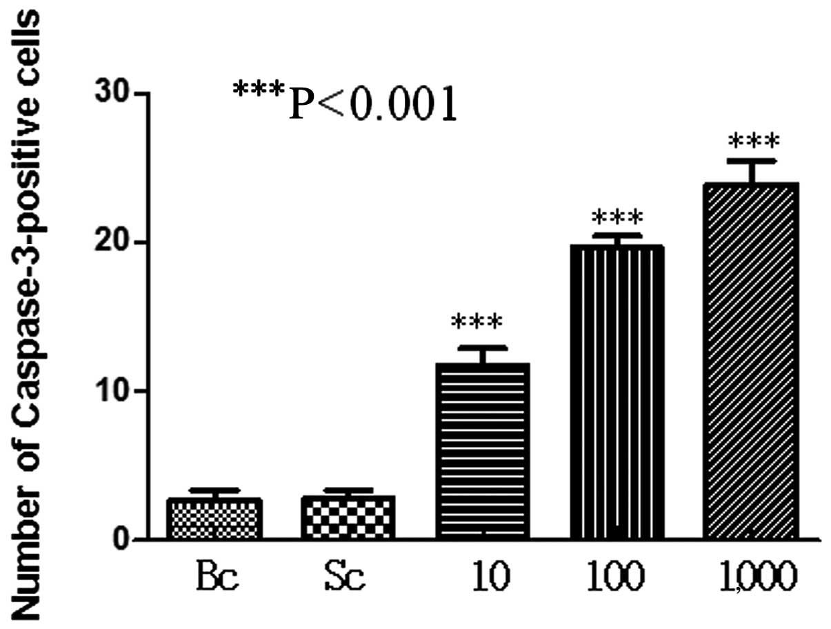 Immunohistochemical results showed that the expression of caspase-3 in the spermatogenous, Sertoli, Leydig and peritubular myoid cells was more apparent with an increased dose in the experimental test groups. However, the expression of caspase-3 was not evident in the control group. Differences were statistically significant compared with the control group (P<0.001) (Figs. 4 and 5).