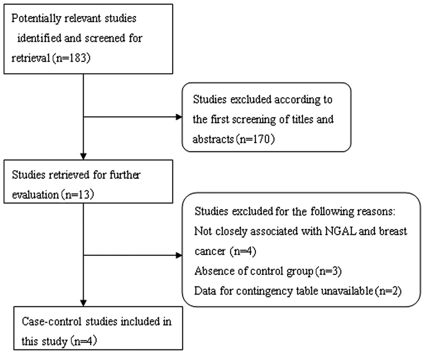 The systematic literature search generated a total of 183 references based on the search strategy. We excluded 170 studies after screening the titles and abstracts, as the majority of these studies did not fulfill the criteria for our meta-analysis, while others were excluded due to duplication or review articles. A careful review of the remaining 13 studies revealed that 4 studies did not focus on the association between NGAL and breast cancer, and were excluded. Subsequently, a further 5 studies were excluded; 3 studies were excluded as they were performed on tissue microarrays and lacked control groups (25–27) and 2 studies were excluded as they did not interpret the IHC results with regard to negative/positive and had insufficient data for constructing the 2×2 contingency tables (24,28). Following exclusion of the abovementioned studies, 4 studies were included in this meta-analysis (29–32). A flow chart showing the study selection procedure is given in Fig. 1.
