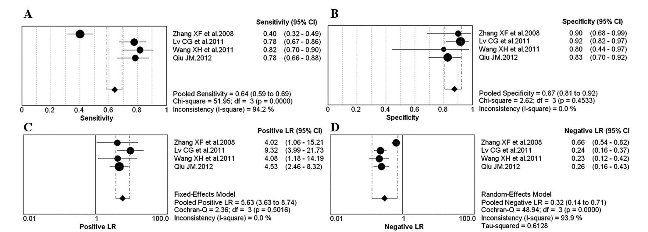 Cochran’s Q test and the I2 statistic were used to evaluate the presence of statistical heterogeneity in the 4 studies examined (Figs. 2 and 3), and the following results were identified: pooled sensitivty (Chi-square=51.95, I2=94.2%, P<0.001), specificity (Chi-square=2.62, I2=0, P>0.05), PLR (Chi-square=2.36, I2=0, P>0.05), NLR (Chi-square=48.94, I2=93.9%, P=0.001) and DOR (Chi-square=4.01, I2=25.3, P>0.05). By meta-regression analysis, the number of cases in control group or QUADAS score was not the heterogeneity source.
