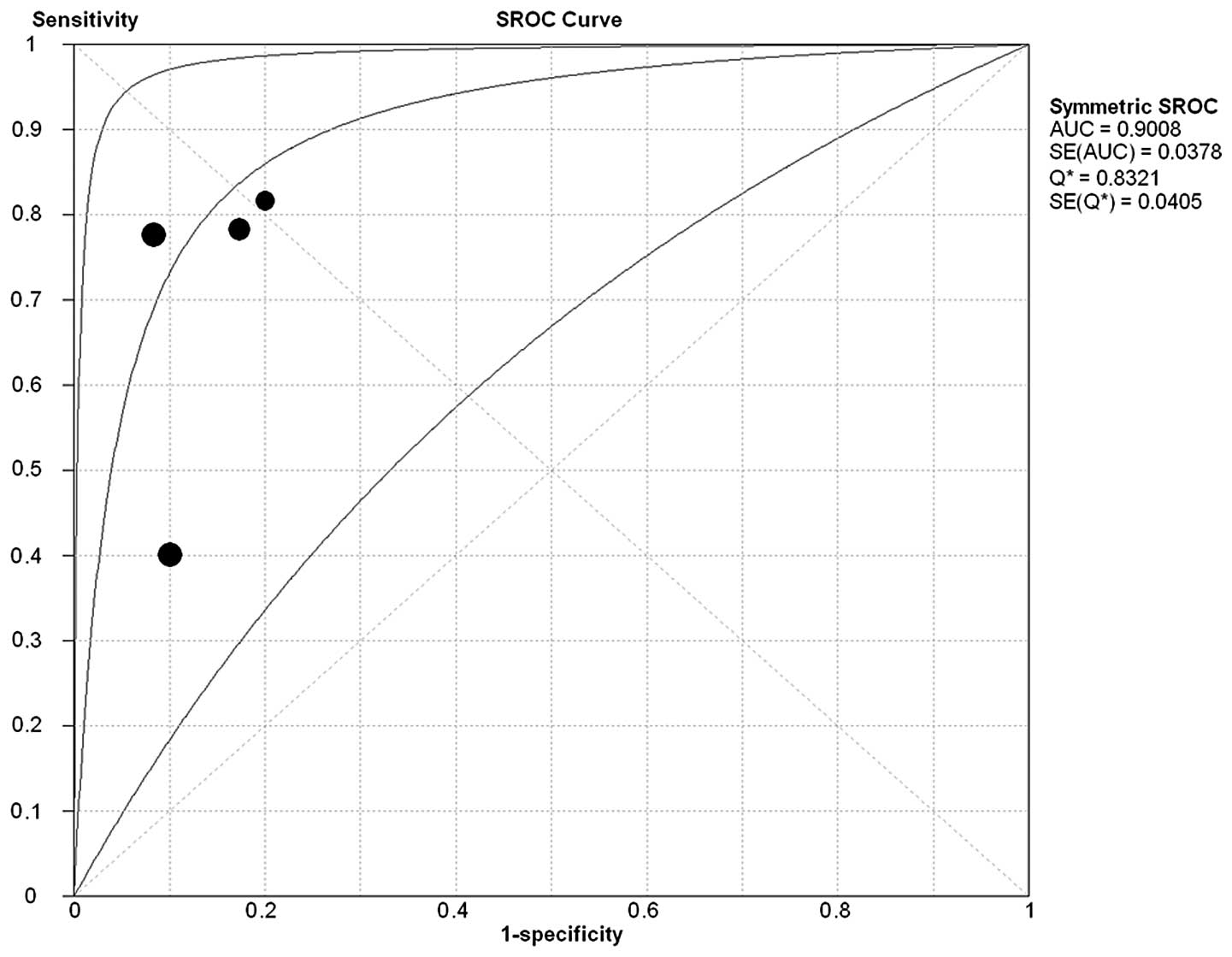 The heterogeneity of the 4 studies was analyzed. Results of the Spearman’s correlation coefficient indicated that heterogeneity was not correlated with the threshold effect. The factors, number of controls and QUADAS score were added to the meta-regression, but these did not explain the heterogeneity. We hypothesized that the heterogeneity was due to the limited sample size of the 4 selected studies in this meta-analysis.