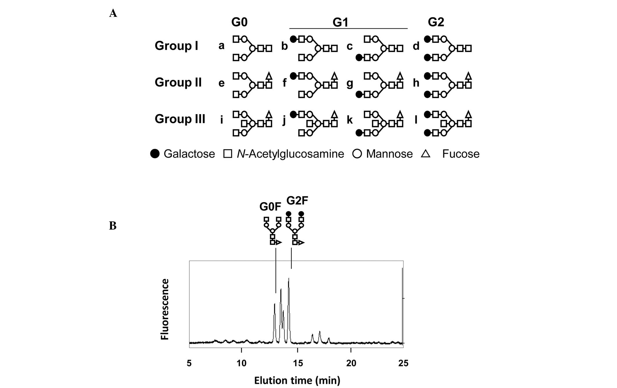 Takahashi N, Ishii I, Ishihara H, et al: Comparative structural study of the N-linked oligosaccharides of human normal and pathological immunoglobulin G. Biochemistry. 26:1137–1144. 1987. View Article : Google Scholar : PubMed/NCBI