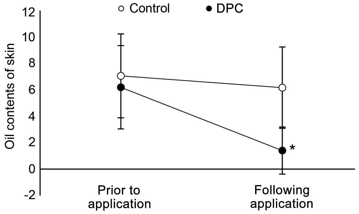The effects of skin pores on skin topographic features can be reduced by decreasing excessive production and accumulation of sebum and elimination of comedones. Therefore, a cosmetic cleanser that regulates sebum homeostasis is required. In the present study, the effects of a cosmetic cleanser that contained Diospyros kaki folium, Polygonum cuspidatum and Castanea crenata var. dulcis (DPC) was examined on the removal of sebum and on skin pore size. Healthy volunteers (n=23) aged 20‑50 years were asked to apply the test materials to the face. Skin oil content, pore size, pore number and extracted sebum surface area were measured using various measurement methods. All the measurements were performed at pre‑ and post‑application of the test materials. When the cosmetic cleanser containing DPC was applied to the skin, the oil content decreased by 77.3%, from 6.19 to 1.40. The number of skin pores decreased by 24.83%, from 125.39 to 94.23. Skin pore size decreased from 0.07 to 0.02 µm3 (71.43% decrease). The amount of extracted sebum increased by 335% when the DPC cleanser was used. Compared to the control cleanser, skin oil content was significantly decreased when the cleanser that contained DPC was used. The cleanser containing DPC also decreased pore size and number. Finally, the DPC cleanser easily removed solidified sebum from the skin.