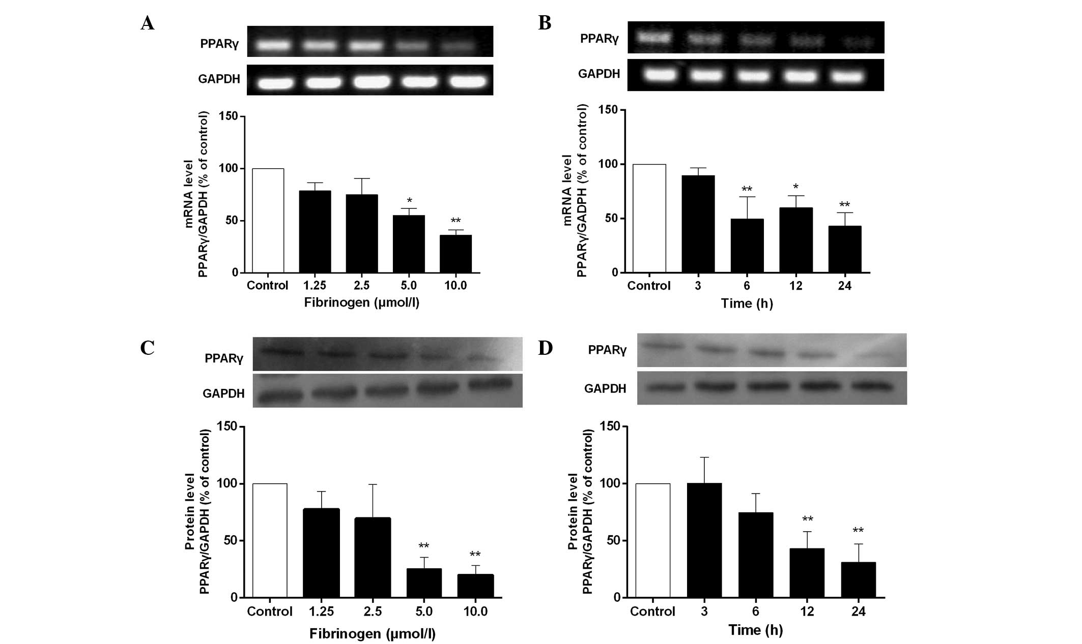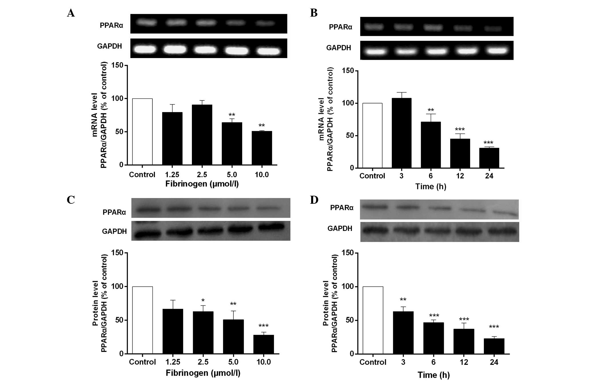 Fig. 1 shows that fibrinogen significantly downregulated mRNA and protein expression of PPARα in VSMCs in concentration- and time-dependent manners compared to control. The maximal inhibition of PPARα was reached at 10 µmol/l fibrinogen and the inhibitory rate was 48.9% for mRNA expression and 71.8% for protein expression.