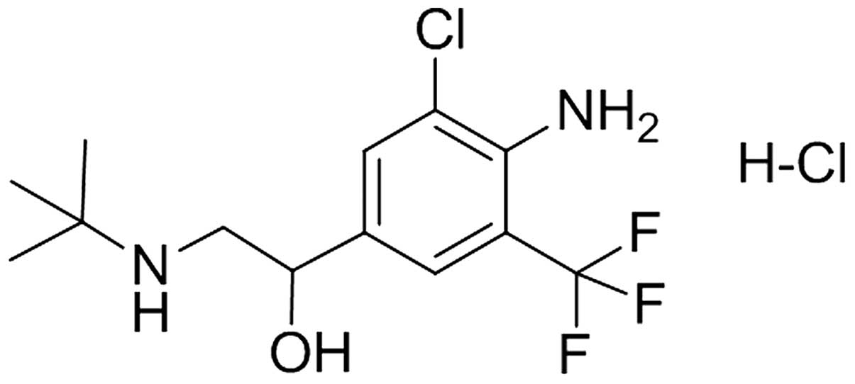 Mabuterol hydrochloride (Mab) (Fig. 1) as a novel β2-agonist with high selectivity has good pharmacokinetic properties, such as an orally complete absorption and a long duration of action, and it has been clinically used as a bronchodilator in the treatment of asthma (8). Pharmacodynamic studies of Mab have been conducted since it was first synthesized by German scholars in 1984. Osada et al (9) studied the effect of Mab on the cardiovascular system and smooth muscle organs of rats, cats and dogs and made a comparison with those of isoprenaline, salbutamol and procaterol. They found that the drug did not influence α-adrenergic, acetylcholine (Ach) and histamine receptors, and was a specific β2 blocker with no β1-stimulation. The effect on blood pressure and peripheral vascular resistance in dogs was 365 and 118 times less compared to isoprenaline. Additionally, it was shown in the study by Akahane et al (10) that Mab, when injected into the sinus node artery of the isolated atrium, dose-dependently increased the atrial rate and contractile force, which were inhibited by a selective β2-receptor antagonist, ICI 118551, and only slightly attenuated by atenolol. These weak-positive chronotropic and inotropic effects were clearly produced by stimulating β2-adrenoceptors on the perfused canine right atrium. However, there is limited literature regarding the precise mechanism of action for Mab.
