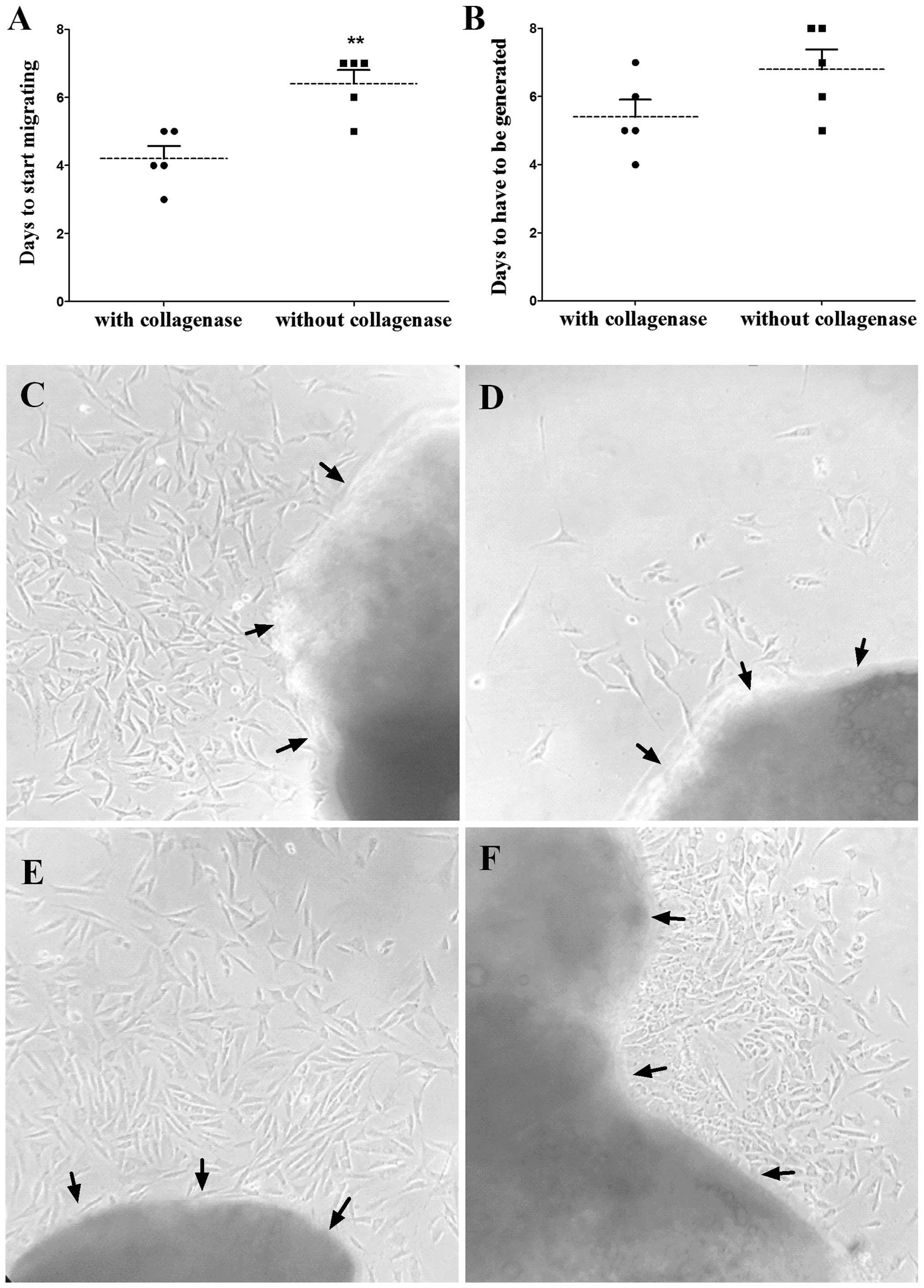 As is shown in Fig. 2, the number of days for the ASM cells to start migrating out of the ‘tissue blocks’ (Fig. 2A) were significantly different between the groups treated with the two methods. The number of days for the culture to generate, as it comprised too many cells (Fig. 2B), appeared to be different between the two groups. The average time was 4.2 days for the cells to start growing out in the culture pretreated with collagenase, which was less than that (6.4 days) in the culture without pretreatment with the enzyme. The time for the dense cells to be initially passed was 5.4 days in the collagenase group and 6.8 days in the collagenase-free group, which also showed a high efficacy with the CPTT method. The status of the cells in the two groups on day 6 after the guinea pig tracheal smooth muscle strip was planted is shown in Fig. 2C and D. The ASM cells in Fig. 2C were evidently thick, with a density ~80%, while those in Fig. 2D were just beginning to migrate out of the pieces at the same time. In addition, the status of the ASM cells migrating from the second-hand pieces treated with the CPTT method was better than that of the traditional method (Fig. 2E and F).