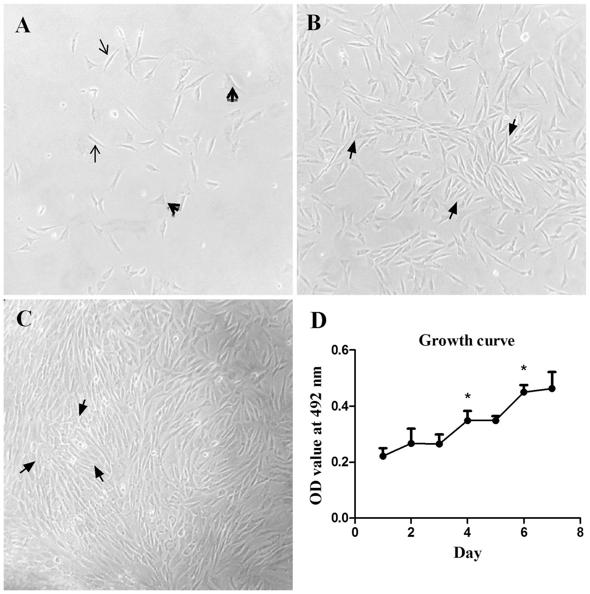 Cell viability was determined with the MTT assay at days 1 to 7, respectively, after they were generated. As was observed in the growth curve of Fig. 3D, OD values increased significantly on days 4 and 6 (P<0.05), which indicated that the cells proliferated significantly.