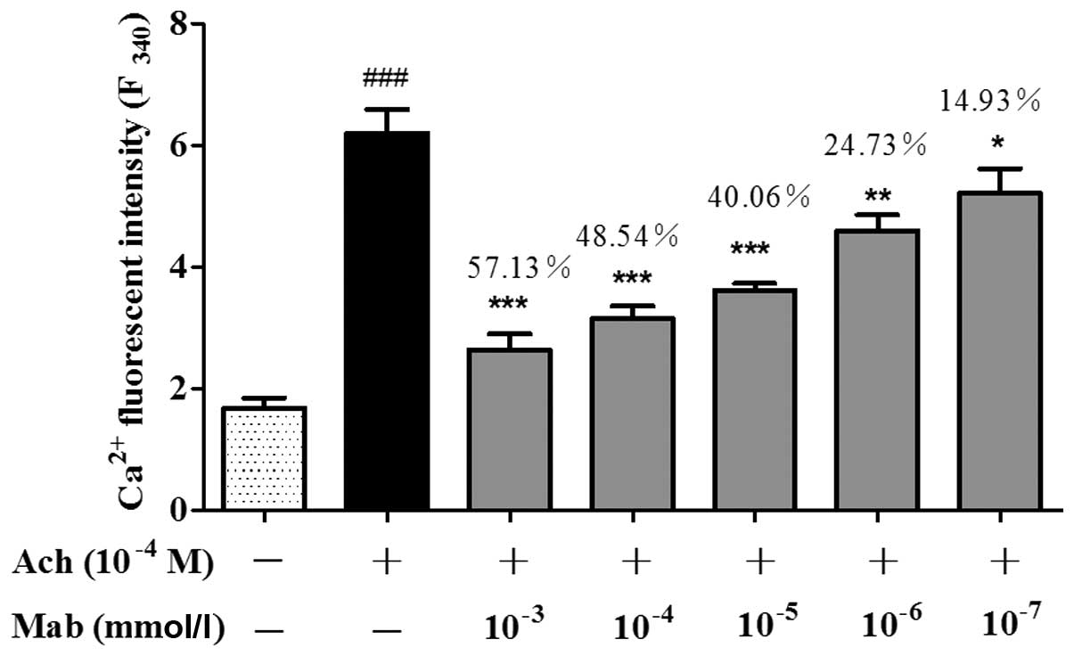 As shown in Fig. 5, Ach (10−4 M) significantly increases Ca2+ fluorescent intensity when it was determined with the multimode microplate reader. Mab (10−3, 10−4, 10−5, 10−6 and 10−7 mmol/l) significantly suppressed this increase in a concentration-dependent manner. The inhibitory rates of intracellular Ca2+ at different concentrations of Mab, from low to high, were 14.93, 24.73, 40.06, 48.54 and 57.13%, respectively (Fig. 5).