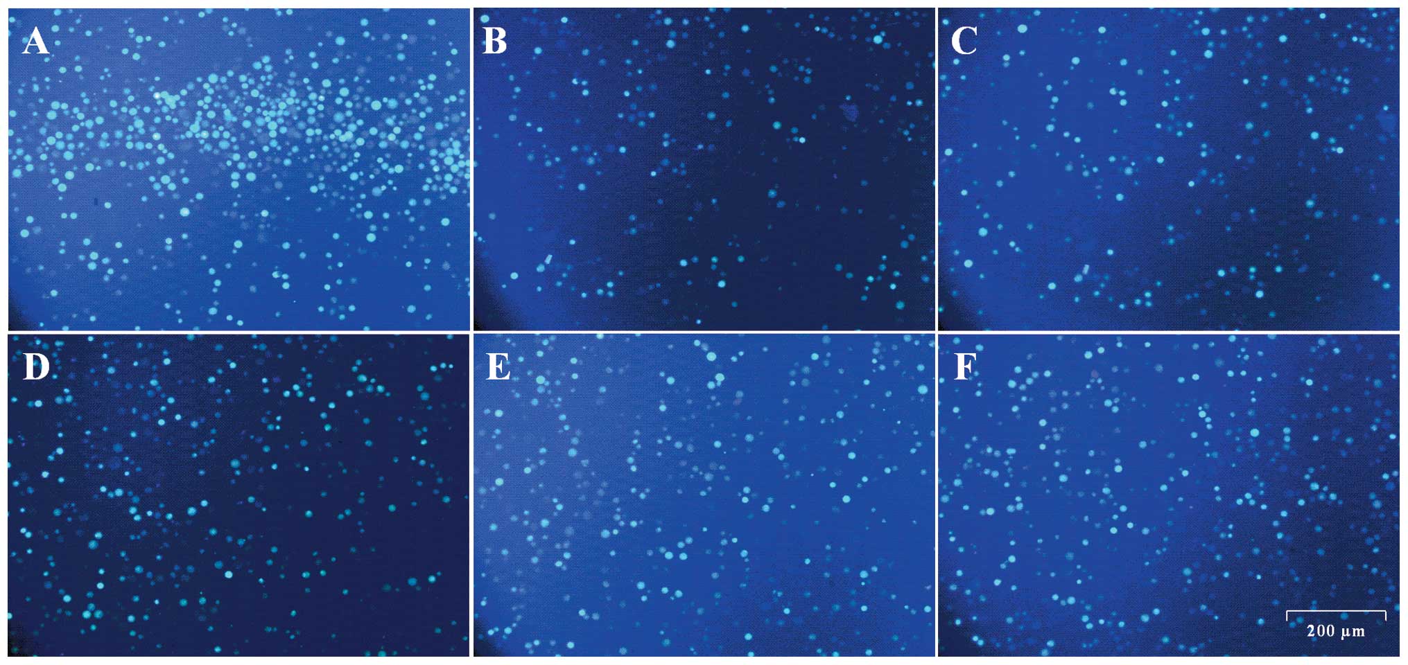 Representative images of Ca2+ fluorescence obtained from the inverted fluorescent microscope are indicated in Fig. 6. More fluorescent spots and higher fluorescent intensity can be observed in the sample treated with Ach (Fig. 6A) compared with those in the samples pre-incubated with 10−3, 10−4, 10−5, 10−6 and 10−7 mmol/l of Mab and subsequently with Ach (Fig. 6B–F). The fluorescent intensity of the sample treated with the highest concentration of Mab, 10−3 mmol/l (Fig. 6B), was the least among all the Mab-treated samples (Fig. 6B–F).