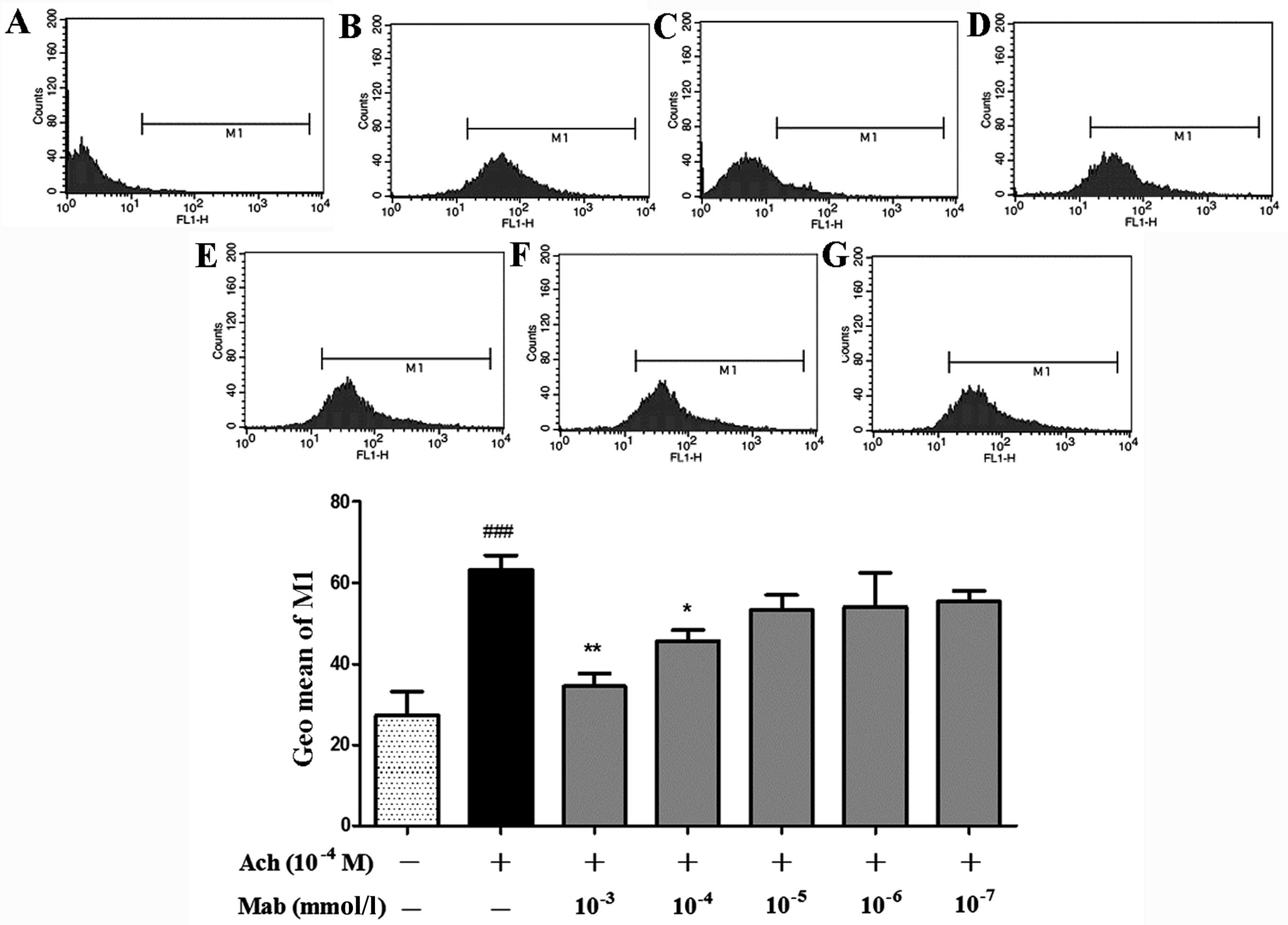 The geometric mean (Geo Mean) of the M1 range in the diagram of flow cytometry (Fig. 7) was analyzed to determine Ca2+ fluorescent intensity. Ach (10−4 M) significantly increases intracellular Ca2+ compared with the control and Mab at the concentration of 10−3 mmol/l, and 10−4 mmol/l significantly suppresses the elevation of Ca2+ fluorescent intensity induced by Ach. When assessing the peak in Fig. 7C, the peak of the cells loaded with Fluo-3/AM following treatment with the highest concentration of Mab, 10−3 mmol/l, shifts significantly to the left compared with that in Fig. 7B (treated with Ach 10−4 M alone). Geo Mean in the flow cytometry diagram of the cells treated with Mab decreases in a concentration-dependent manner, as shown from Fig. 7G to Fig. 7C.
