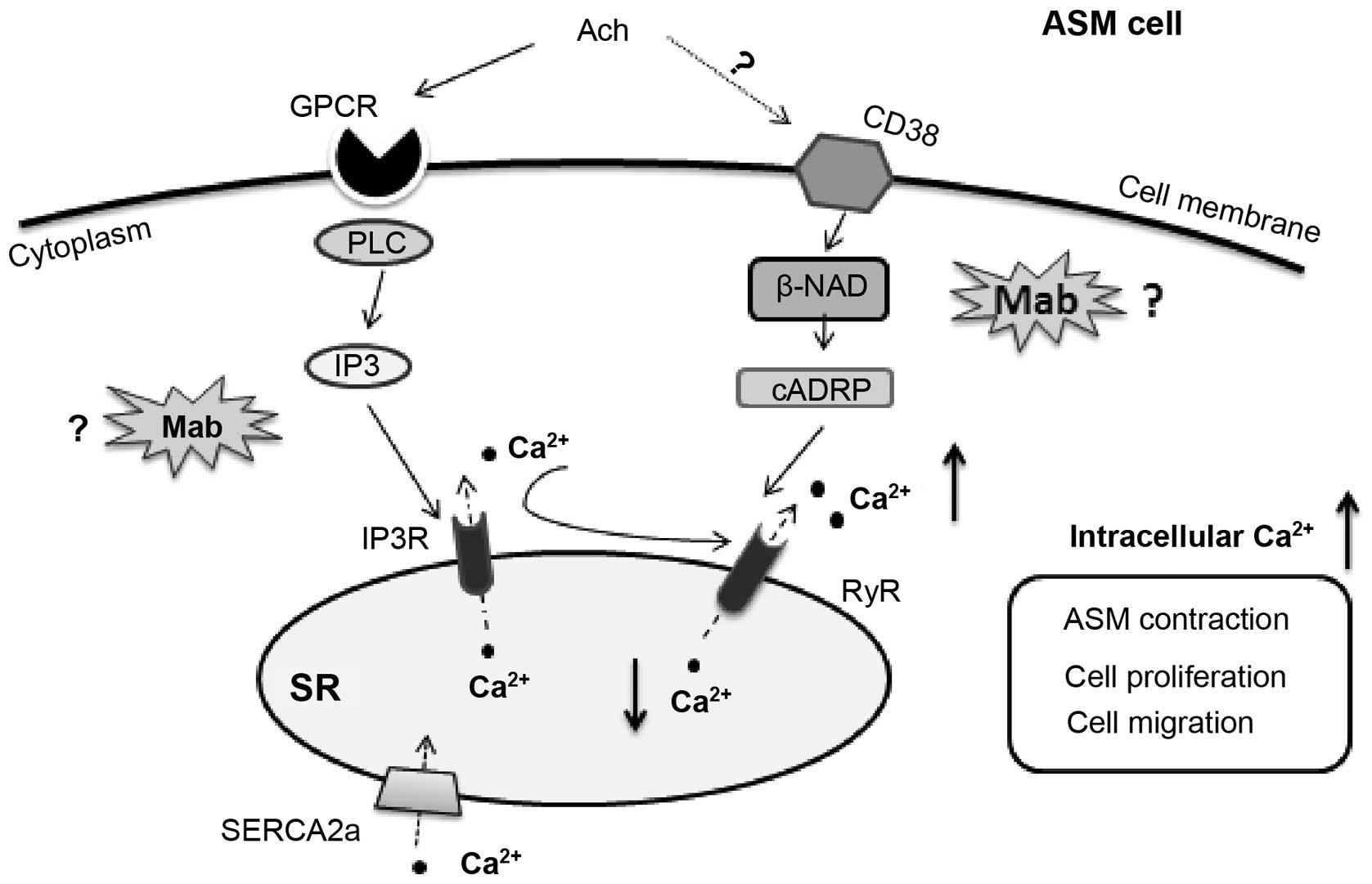 Ach binds G-protein coupled receptors on the membrane of ASM cells to activate phospholipase C, and subsequently, inositoltrisphosphate (IP3) is produced under its catalysis (21). In addition, Ach can stimulate cluster of differentiation 38 to generate cADP-Ribose (cADPR). Ca2+ is released from SR into the cytoplasm subsequent to IP3 stimulating the clusters of IP3 receptors (IP3Rs) on the membrane of SR and/or cADPR stimulating the ryanodine receptor (RyR) (Fig. 8) (22). There is a possibility of RyR increasing again via the mechanism of calcium-induced calcium release following the activation of IP3R when the level of intracellular Ca2+ is high enough, which leads to the evacuation of the SR store and the accumulation of cytoplasmic Ca2+ (23). Intracellular Ca2+ accumulation eventually results in ASM contraction, proliferation and migration. Our previous study identified that the mechanism of tradinterol suppression on the elevation of intracellular Ca2+ may be involved in the IP3R pathway (11). As was suggested in previous studies, tradinterol is a new type of long-acting β2-agonist (24,25). In the present study, Mab was proved to significantly inhibit the calcium increase induced by Ach in guinea pig ASM cells. Further investigation of whether the suppressive activity of the drug on the calcium is the result of the interaction between IP3R and RyR signaling pathways (Fig. 8) is required.