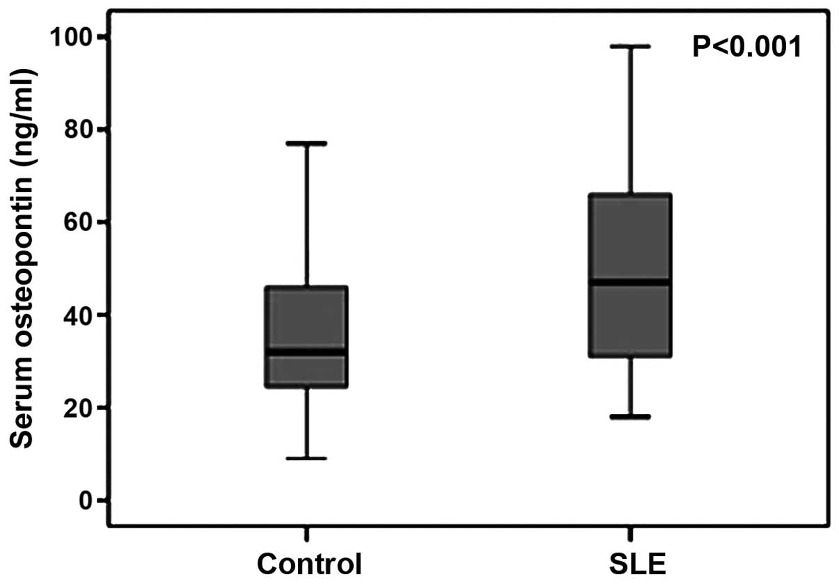 Wong et al (10) revealed that the plasma OPN level was significantly higher in SLE patients and the increased OPN level correlated with the SLE disease activity index score in all SLE patients. Additionally, elevated plasma OPN concentrations were identified in SLE patients with renal impairment compared to controls and they suggested that OPN production was correlated with the inflammatory process.