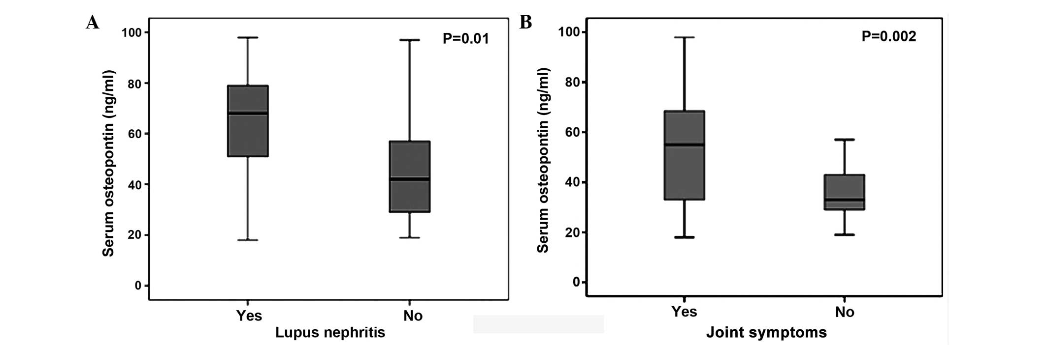 Higher serum OPN levels were observed in SLE patients with LN compared to SLE patients without this manifestation (63.9±19.7 vs. 45.3±20.9 mg/ml, respectively, P=0.01) (Fig. 3A). The serum OPN levels were significantly higher in SLE patients with joint symptoms compared to those without joint symptoms (54.4±22 vs. 36.6±12 mg/ml, respectively, P=0.002) (Fig. 3B).