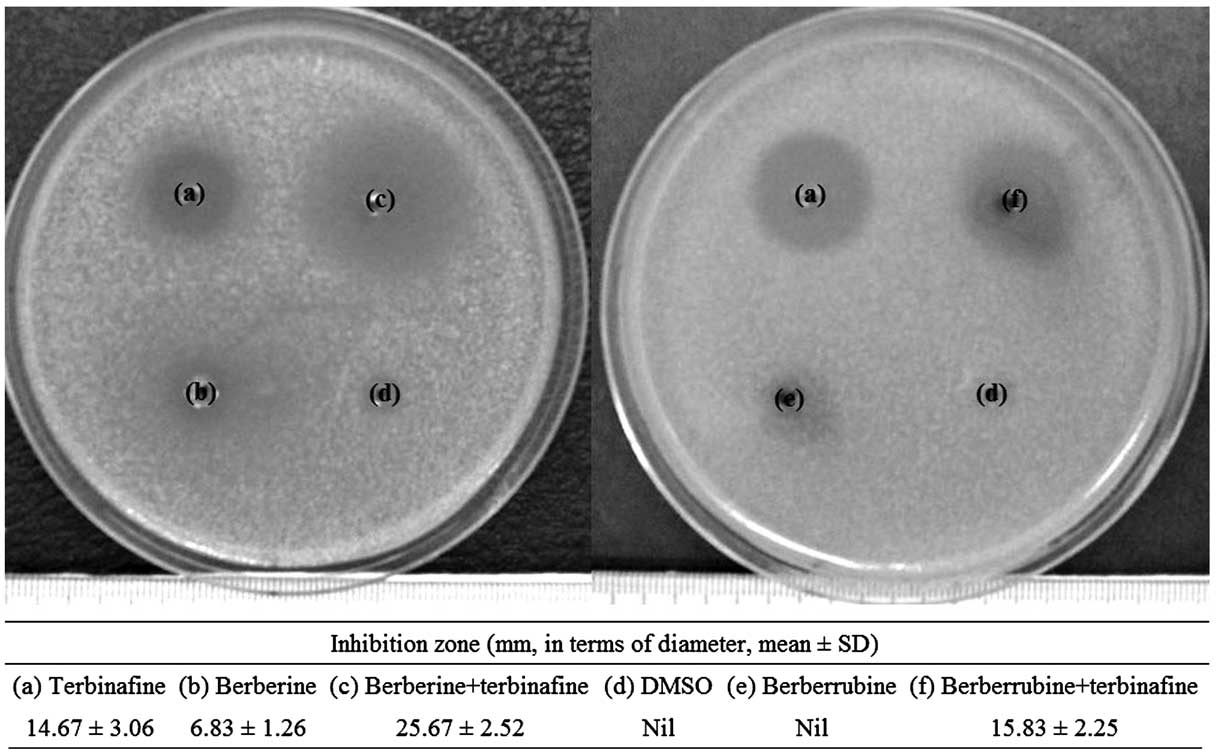 C. albicans was used to study the effectiveness of berberine alone (100 µg), berberine (100 µg) plus terbinafine (6 µg), berberrubine alone (100 µg), and berberrubine (100 µg) plus terbinafine (6 µg) against its growth in culture. C. albicans was diluted with yeast mold broth and plated on the yeast mold agar plate, and the holes were created on the agar using a sterile transfer pipette. For the tested samples, 1% DMSO (as negative control) and 6 µg terbinafine (as positive control) were placed in the holes of agar. The plates were subsequently incubated at 35°C for 48 h and the inhibition zones (mm, in terms of diameter) of fungi on the agar plates were recorded (23,25,26).