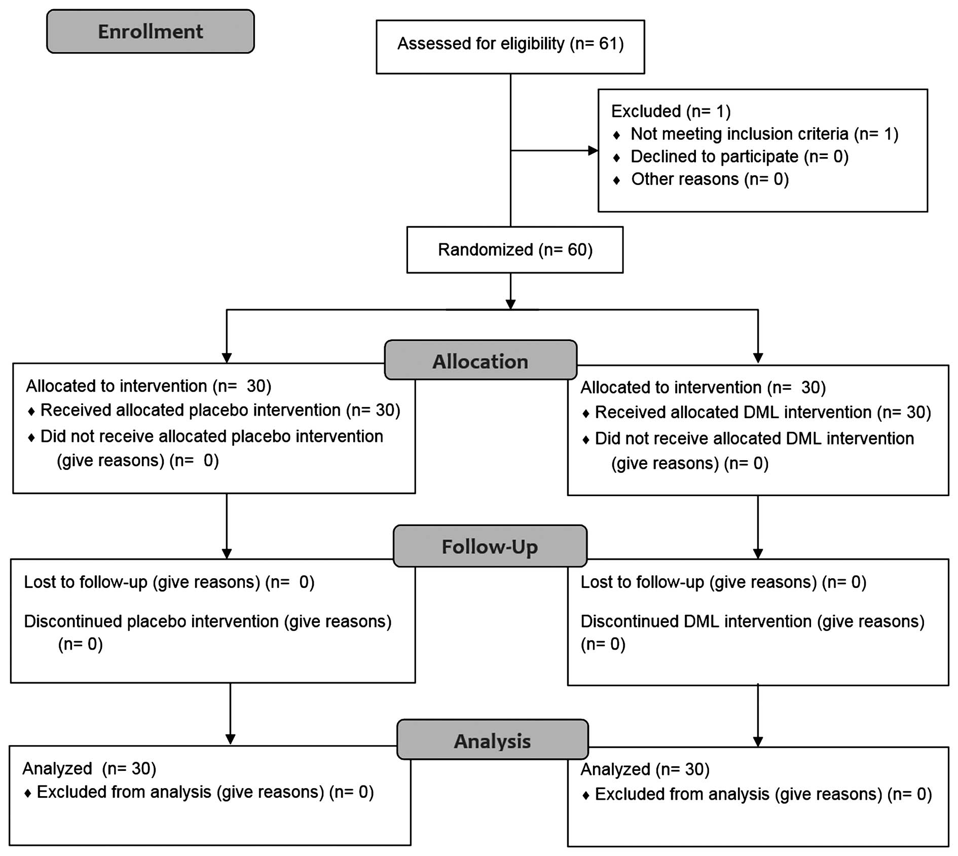 For heavy metal, lipid peroxidation and antioxidant analysis, the assay was performed prior and subsequent to administration of the test product and the placebo (Fig. 2). All the subjects were instructed to ingest the tablets after breakfast over a 60-day period. The placebo group was comparable in all characteristics to the DML group. Food and water intake was not limited.