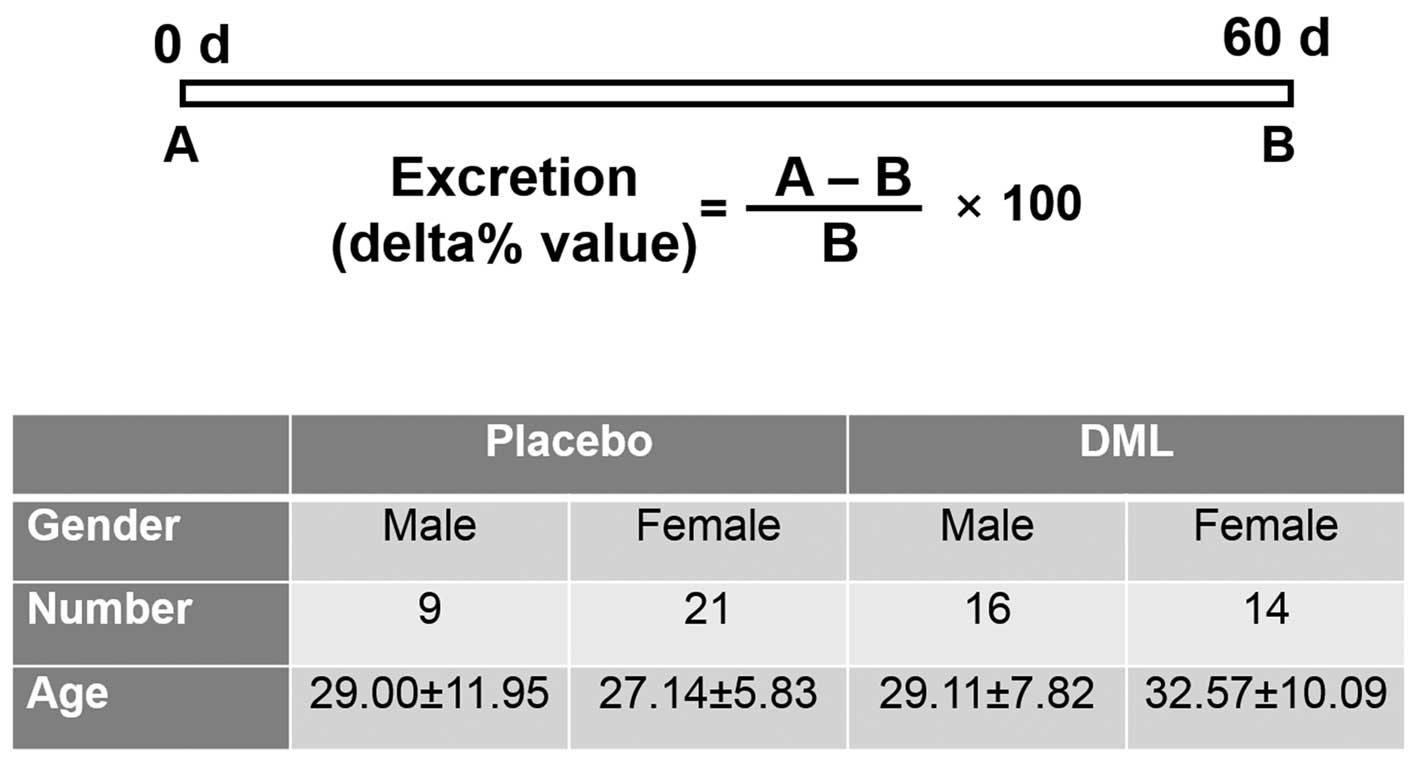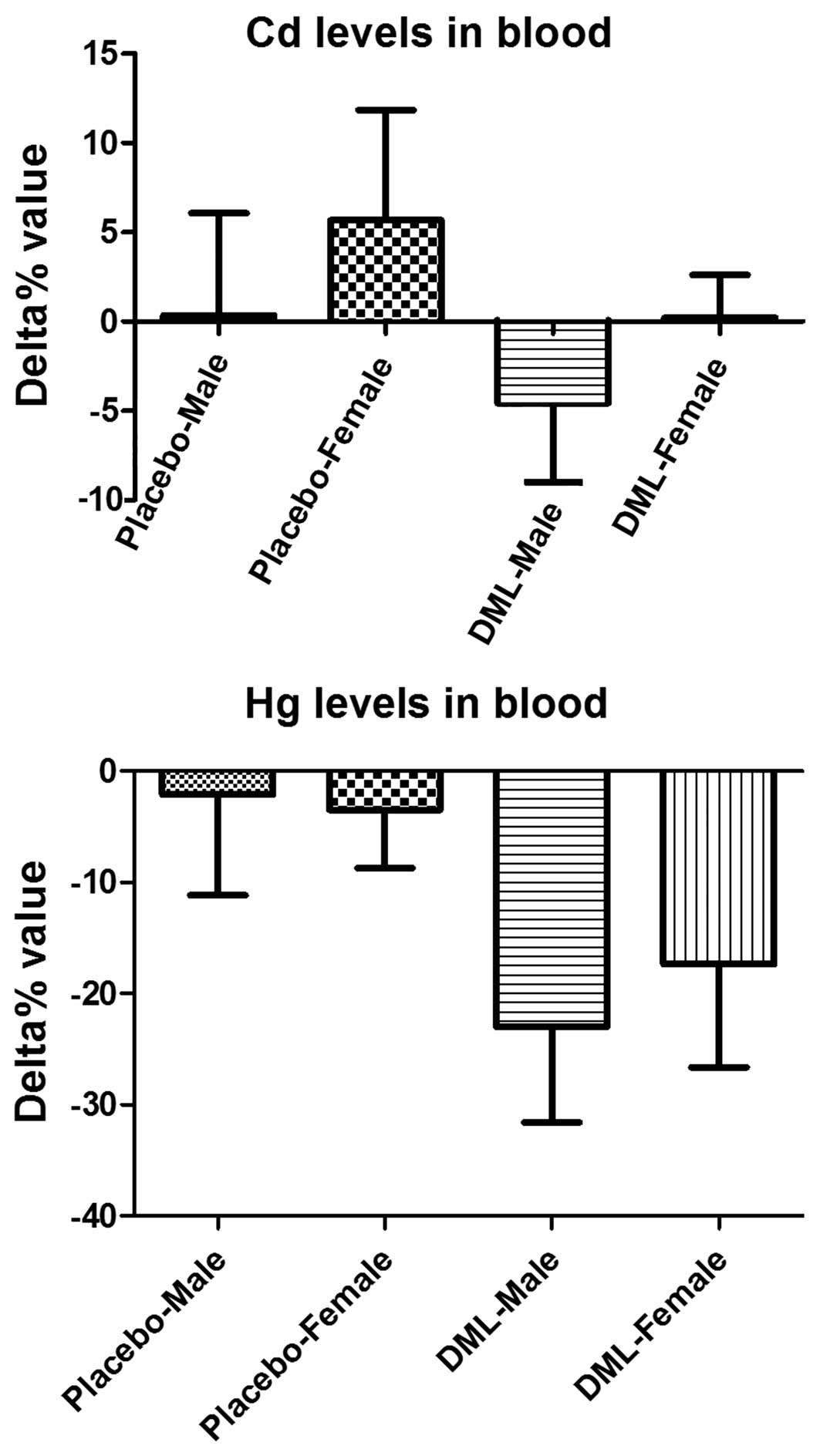 Several lines of evidence demonstrate that DML and its components reduce reactive oxygen species generation and have antioxidant effects (13,14). In addition, our previous study demonstrated that DML facilitates Cd excretion and exerts antioxidant effects against Cd-induced oxidative damage (11). The present study attempted to use DML to facilitate Cd and Hg excretion in humans and to increase the antioxidant capacity in the serum, as Cd and Hg have been shown to inhibit antioxidant enzymes (15–17).