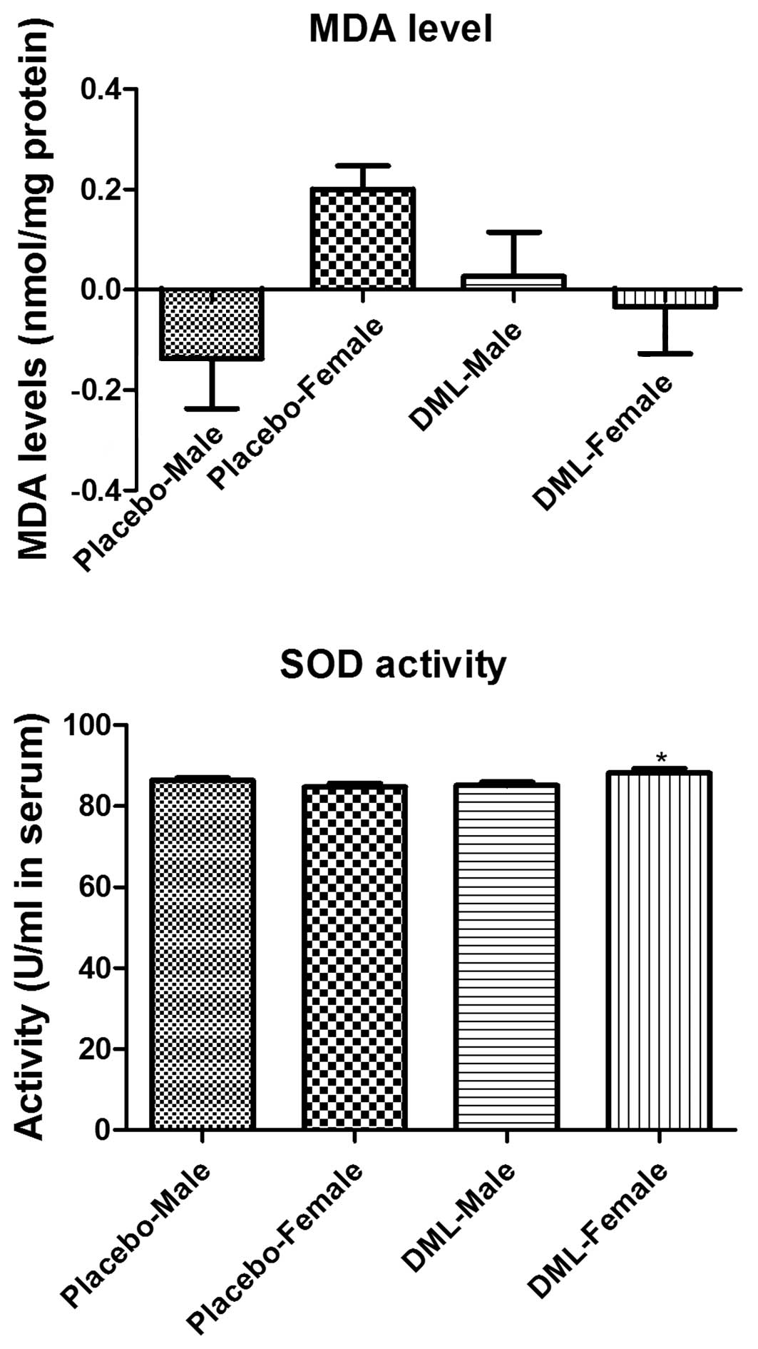 Serum MDA levels were increased in the DML-male group compared to the placebo-male group (P=0.3125), while these were decreased in the DML-female group compared to the placebo-female group (P=0.0842) (Fig. 4); however, no significant differences were identified.