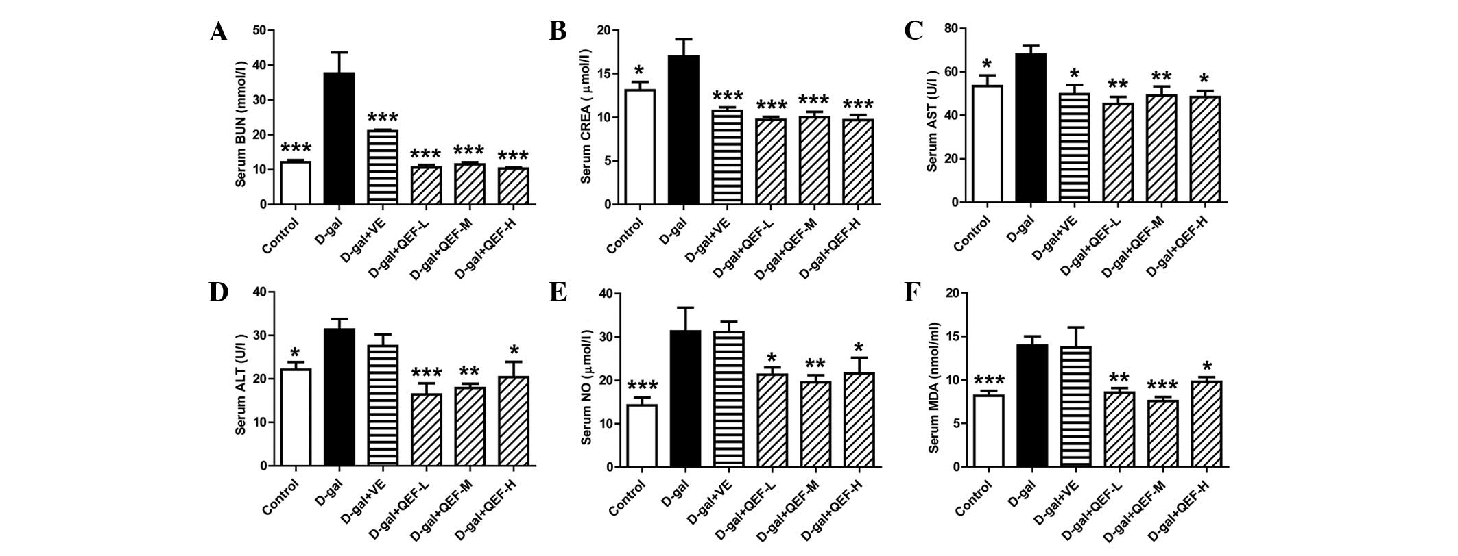 Blood BUN and CREA are the common indicators for kidney health, while ALT and AST are the common parameters for the evaluation of liver health. In the present study, chronic D-galactose administration was shown to increase all the serum parameters significantly. By contrast, QEF treatment could efficiently prevent against the elevation of BUN, CREA, ALT and AST, implicating a protective effect on the liver and kidney. However, its mechanism remains to be elucidated at the current stage and requires further investigation.