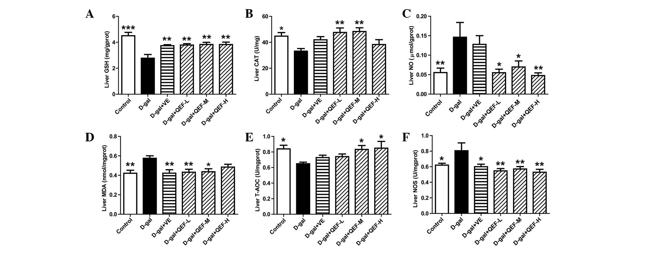 In the mouse liver, long-term D-galactose treatment decreased GSH level and reduced T-AOC and CAT activities (P<0.05 or P<0.001) (Fig. 3A–C). However, it induced the elevation of NO, MDA levels and NOS activity (P<0.05 or P<0.01) (Fig. 3D–F). Following QEF treatment, all the biochemical parameters in liver were improved. However, the positive control, VE, improved GSH, MDA and NOS in the liver (P<0.05 or P<0.01). These suggested that QEF improved the antioxidative system in liver.