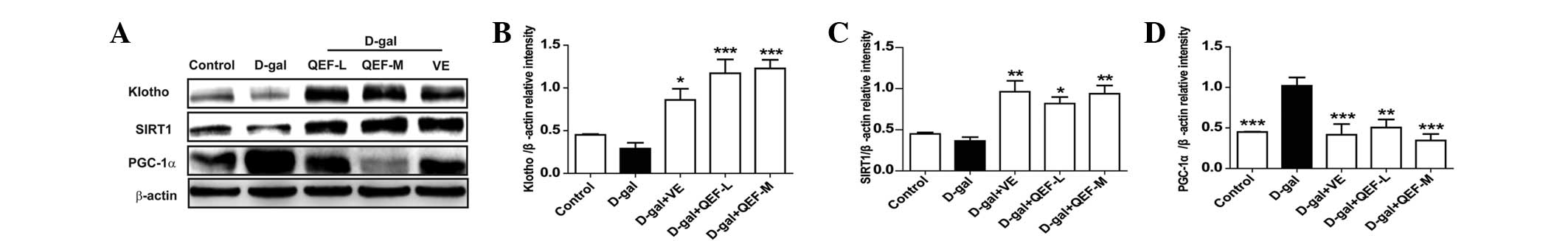 In the hippocampus, D-galactose did not show significant changes in mRNA expression levels of Klotho, SIRT1, FOXO3, PGC-1α, IGF-1 and PRDX-3 (Fig. 4), the genes that are well known to be actively involved in aging process. However, QEF treatment for 8 weeks could elicit significant upregulation of these genes (P<0.05, P<0.01 or P<0.001), which appeared to be in a dose-dependent manner. By contrast, VE treatment only enhanced the gene expression of Klotho (P<0.01). Consistent with its effect on mRNA expression, QEF treatment induced significant expression of Klotho and SIRT1 at protein levels (P<0.05, P<0.01 or P<0.001) (Fig. 5A–C). In terms of PGC-1α, D-galactose induced marked elevation of the protein (P<0.001), the effect of which could be counteracted by QEF treatment (P<0.01 or P<0.001) (Fig. 5D). For VE, it increased Klotho and SIRT1 levels, but reduced the PGC-1α level (P<0.05, P<0.01 or P<0.001). These results implicated that QEF administration improved the aging process in hippocampus.