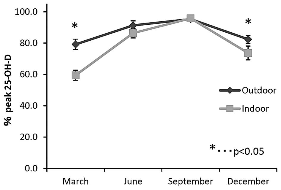Data are presented as mean ± standard deviation. Seasonal changes in each group were determined using the Friedman test followed by Dunn-Bonferroni post hoc test. The difference in the mean ratio of peak 25-OH-VD in each season was assessed using the Mann-Whitney U test. Statistical analysis was performed using IBM SPSS Statistics version 19 (IBM Japan, Tokyo, Japan). P<0.05 was considered to indicate a statistically significant difference.