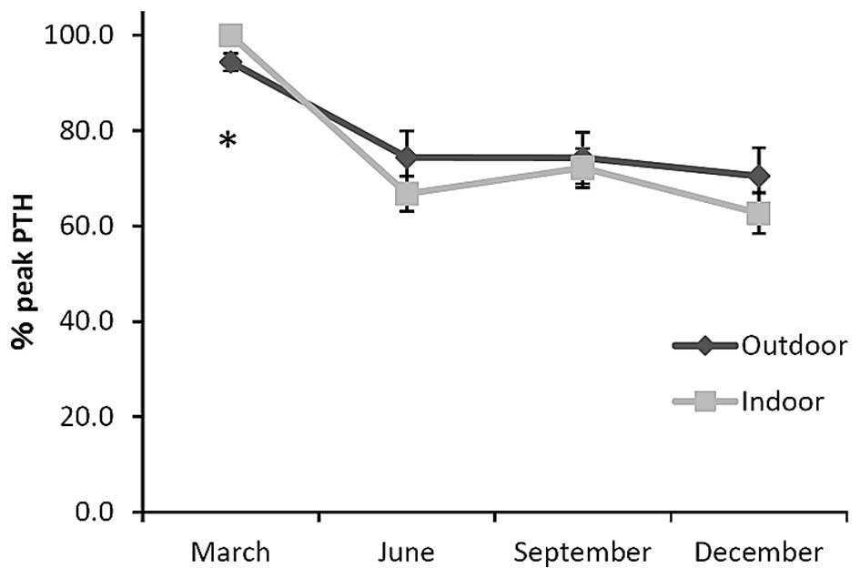 Seasonal PTH and Ca variations showed opposite but consistent patterns in the two groups, with amplitude greater in the indoor compared to the outdoor athletes. The discrepancies in PTH and Ca variations and amplitude of the variation are likely to be due to the variation of VD status, as low 25-OH-VD levels stimulated PTH secretion via low Ca levels. Gannagé-Yared et al (22) reported a positive correlation between serum 25-OH-VD concentration and Ca in adults between 30 and 50 years old in Lebanon, which is a country with a high sun exposure. Ono et al (11) reported that serum 25-OH-VD concentrations correlated negatively with intact PTH in a normal Japanese population between 20 and 68 years old.