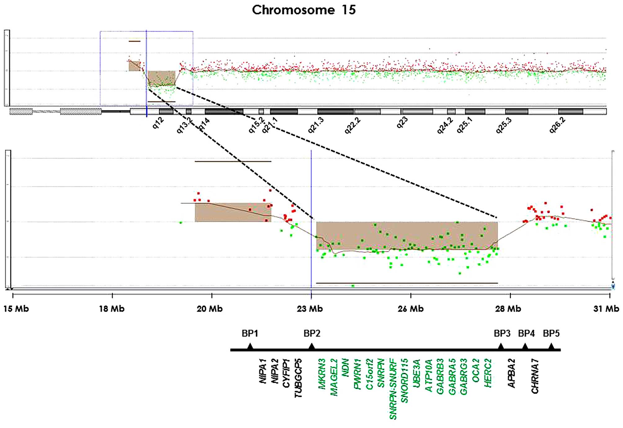 Butler MG, Fischer W, Kibiryeva N and Bittel DC: Array comparative genomic hybridization (aCGH) analysis in Prader-Willi syndrome. Am J Med Genet A. 146A:854–860. 2008. View Article : Google Scholar : PubMed/NCBI | |