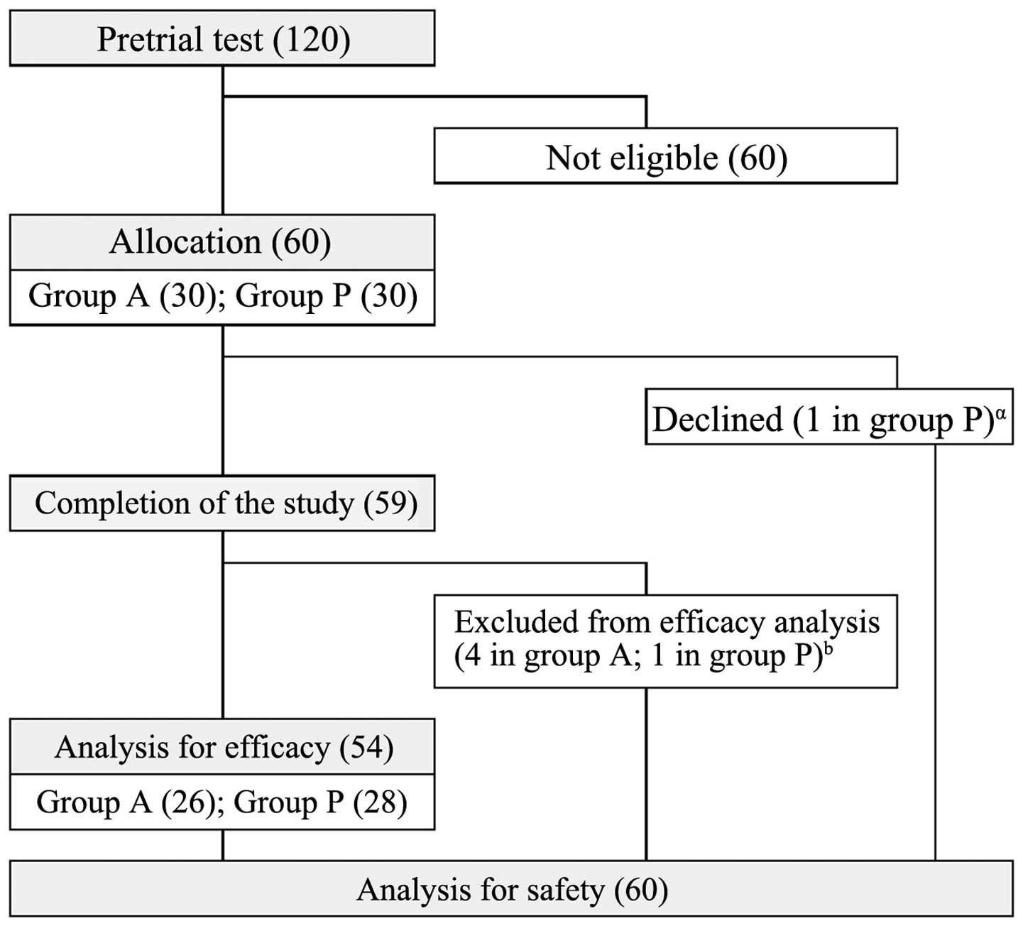 In total, 60 subjects were enrolled and randomly allocated to each of the 2 groups: Group P in which participants received placebo food, or group A in which participants received black-vinegar-mash-garlic-containing food (Fig. 1). The subjects ingested 6 capsules of the respective test article every day. One participant in group P excluded themselves from the study at day 4. The remaining 59 participants completed the study. However, 5 subjects were judged to fall into exclusion criteria and were eliminated from the efficacy analysis for the following reasons: Diagnosed as diabetes mellitus (n=1 in group A), lifestyle change due to hospitalization for lumbar disc herniation (n=1 in group A), and long-term cold that may affect sIgA release (n=2 in group A and n=1 in group P). Thus, the data obtained with 54 participants (n=26 in group A and n=28 in group P) were used for the efficacy analysis (Fig. 1).