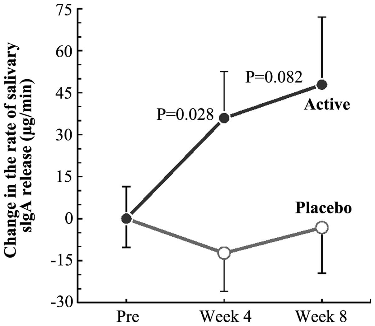 sIgA constitutes a major mucosal immune effector molecule and provides an important first line of defense against pathogens, such as Streptococcus mutans and Porphyromonas gingivalis (14,15). Luminal sIgA is postulated to interfere with pathogen adherence to mucosal epithelial cells and promote intracellular neutralization of pathogens. IgA-secreting cells differentiate in lymphoid tissues associated with mucosa (15). The majority of the IgA-secreting cells reside in the gut mucosa. Increasing evidence suggests that the migration of antibody-secreting cells to the gut is important in conferring protective immune responses (16). The test food used in the present study was provided as a capsule, and the gastrointestinal tract was the first tissue to be exposed to the ingredients it contained. Thus, it is likely that the immune system in the gastrointestinal tract is first stimulated by the intake of black-vinegar-mash-garlic-containing food, and this may in turn affect salivary sIgA release through migration of the antibody-secreting cells to the intraoral mucosal tissues.