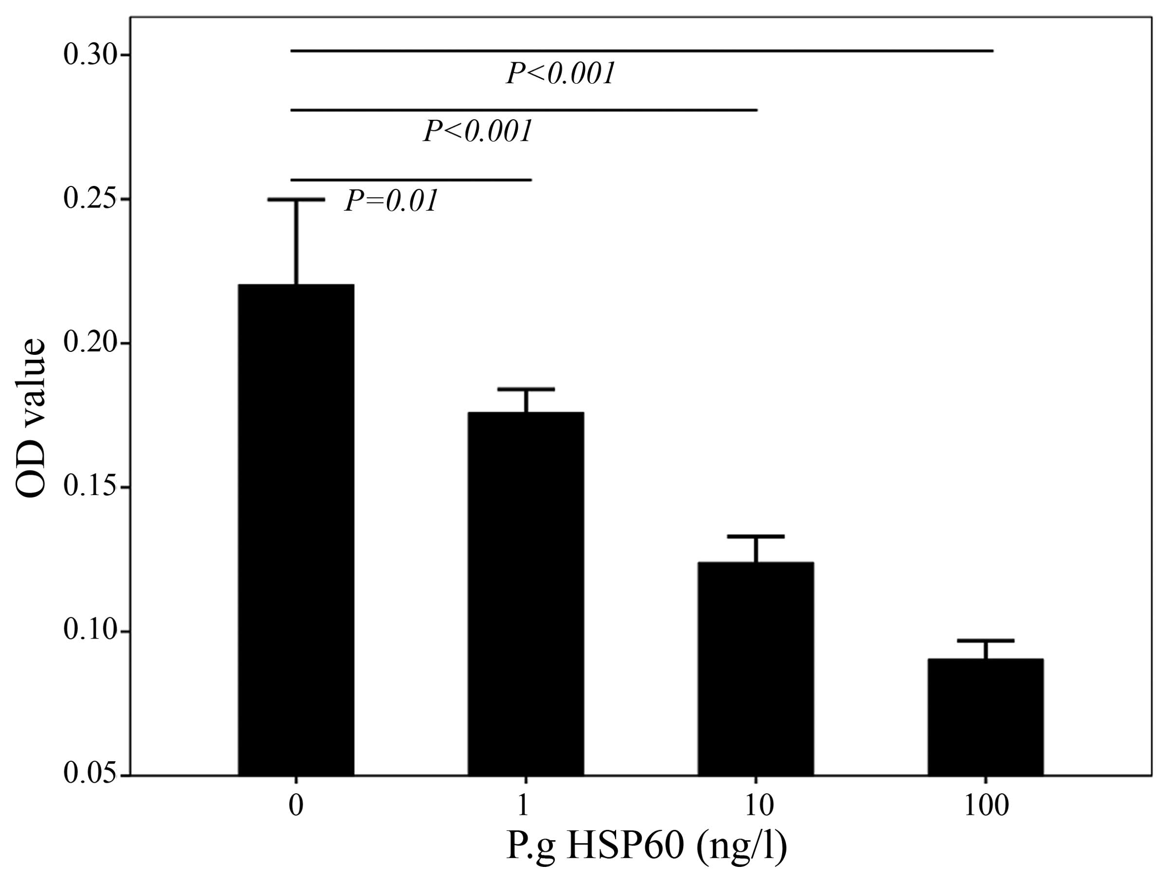 P. gingivalis HSP60 inhibits the proliferation of HUVECs. To examine the effects of P. gingivalis HSP60 on HUVECs, the HUVECs were first treated with different concentrations of P. gingivalis HSP60, and the cell viability was detected using the MTT assay. P. gingivalis HSP60 at 1, 10 and 100 ng/l significantly altered the viability of HUVECs (P<0.05) (Fig. 1).