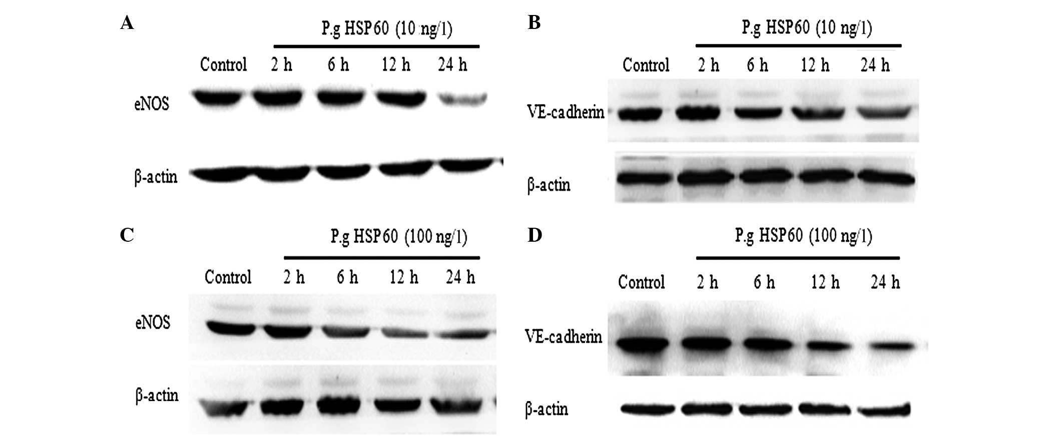 However, the potential pathways linking periodontitis and cardiovascular disease remain to be elucidated (23–25) and the underlying molecular mechanisms from P. gingivalis HSP60 regarding the association between periodontitis and atherosclerosis require further investigation. In the present study, the aim was to investigate whether P. gingivalis HSP60 treatment leads to the dysfunction of HUVECs directly by affecting the protein expression levels of endothelial nitric oxide synthase (eNOS) and vascular endothelial (VE)-cadherin.