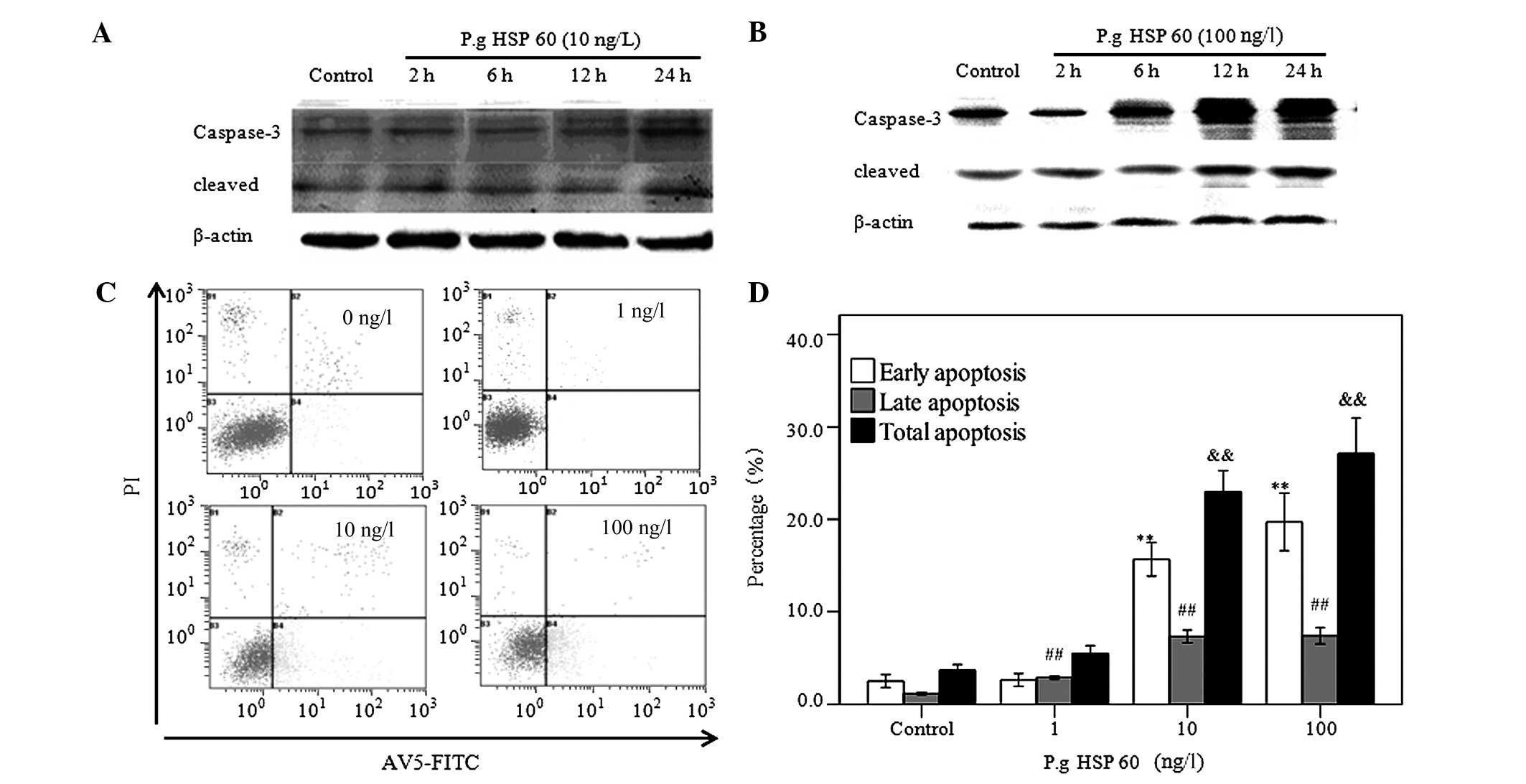 Caspase-3 was detected by western blot analysis. The expression of the cleavage of caspase-3 at 24 h was significantly increased as compared with that of 2, 6 and 12 h treatment with P. gingivalis HSP60 (10 ng/l) (Fig. 3A), and when HUVECs were treated with P. gingivalis HSP60 at 100 ng/l, the expression of the cleavage of caspase-3 at 12 h was significantly increased as compared with that at 2 and 6 h (Fig. 3B). The apoptosis of HUVECs was analyzed by annexin V/FITC staining, as shown in Fig. 3C and D. The percentage of total apoptotic cells was 3.86±0.60, 5.52±0.82, 22.99±2.28 and 27.11±3.87% in cells untreated and cells treated with 1, 10 and 100 ng/l of P. gingivalis HSP60, respectively. These results showed that P. gingivalis HSP60 (1, 10 and 100 ng/l) stimulation for 24 h significantly increased the apoptotic rate and induced significant apoptosis on HUVECs in a concentration-dependent manner.