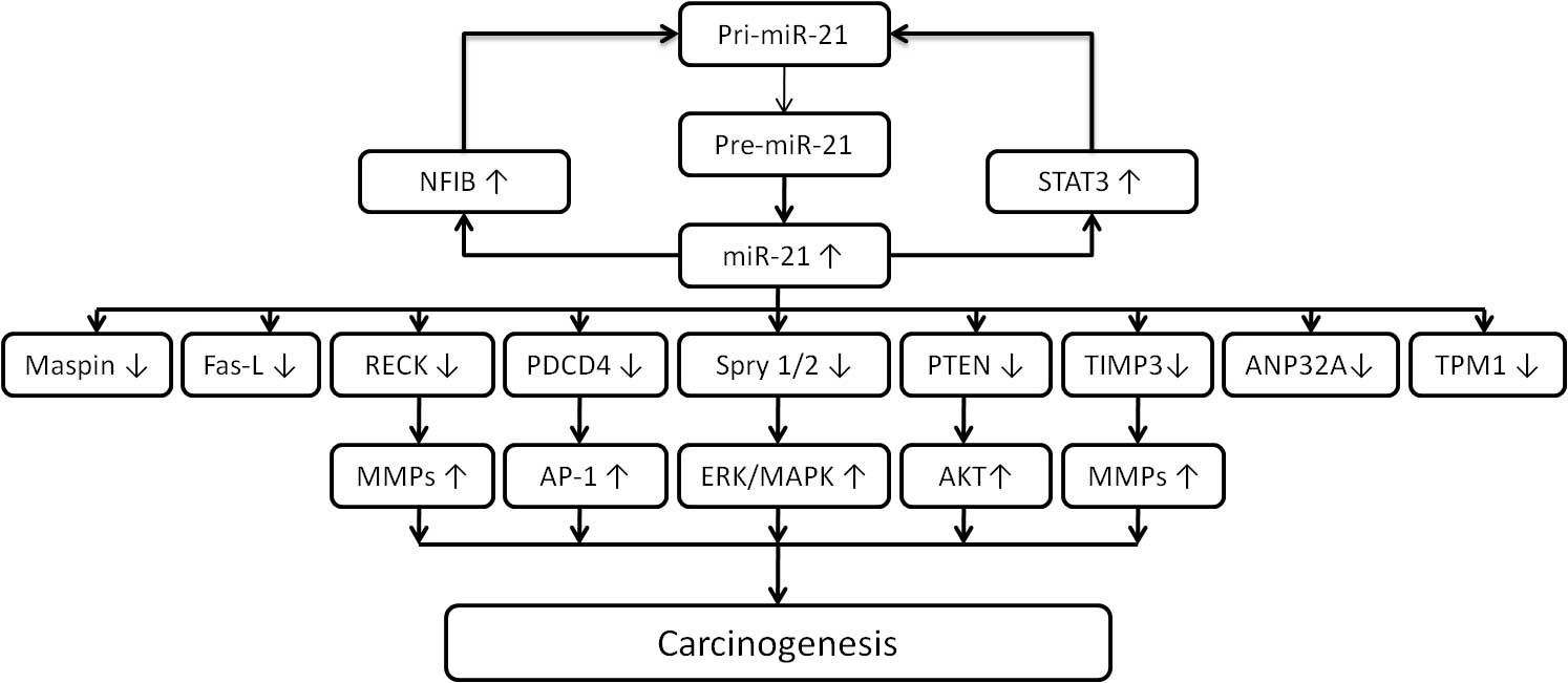 Chen M, Wang F, Yu J, Ma Y and Sun G: MicroRNA-21 induces