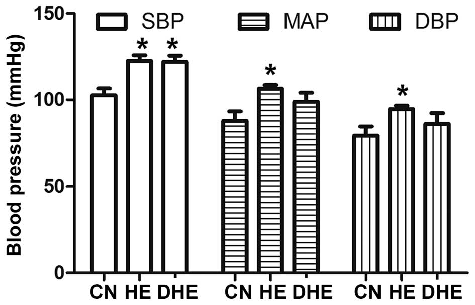 Compared with CN, the heart rate in the HE and DHE groups was retarded, albeit there was no significant difference (P>0.05) (Fig. 1). In the HE group, SBP, DBP and the mean arterial pressure (MAP) of rats were significantly higher than the CN (P<0.05). In the DHE group, the SBP of rats was significantly higher than that of the CN (P<0.05), albeit SBP, DBP and MAP of rats were lower than the rats in the HE group, although there was no statistical significance (P>0.05) (Fig. 2).